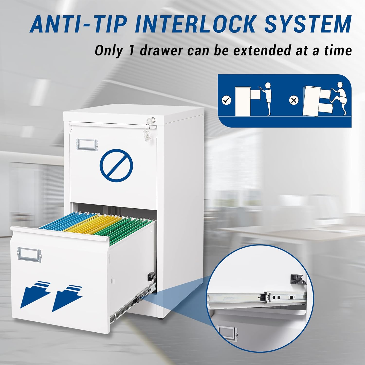 - LOCKABLE 2 DRAWERS FILE CABINET - All the file drawers can be locked by one lock, It is very convenient to control the whole filing cabinet with one key.