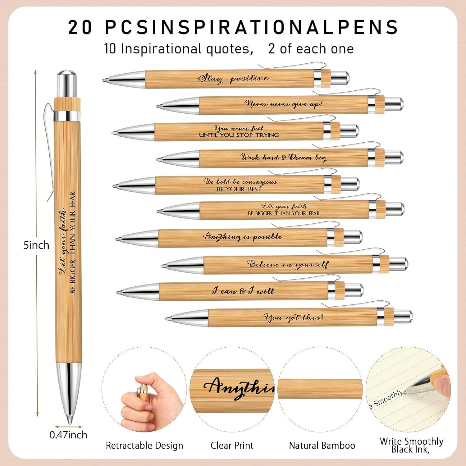 - Appreciation Gifts Bulk: you will receive 20 pcs of motivational spiral notebooks in 10 designs, 2 pcs for each design, each equipped with sticky notes and index tabs, and 20 pcs of retractable bamboo pens in 10 designs, 2 pcs for each design, enough quantity to satisfy your daily use and sharing needs