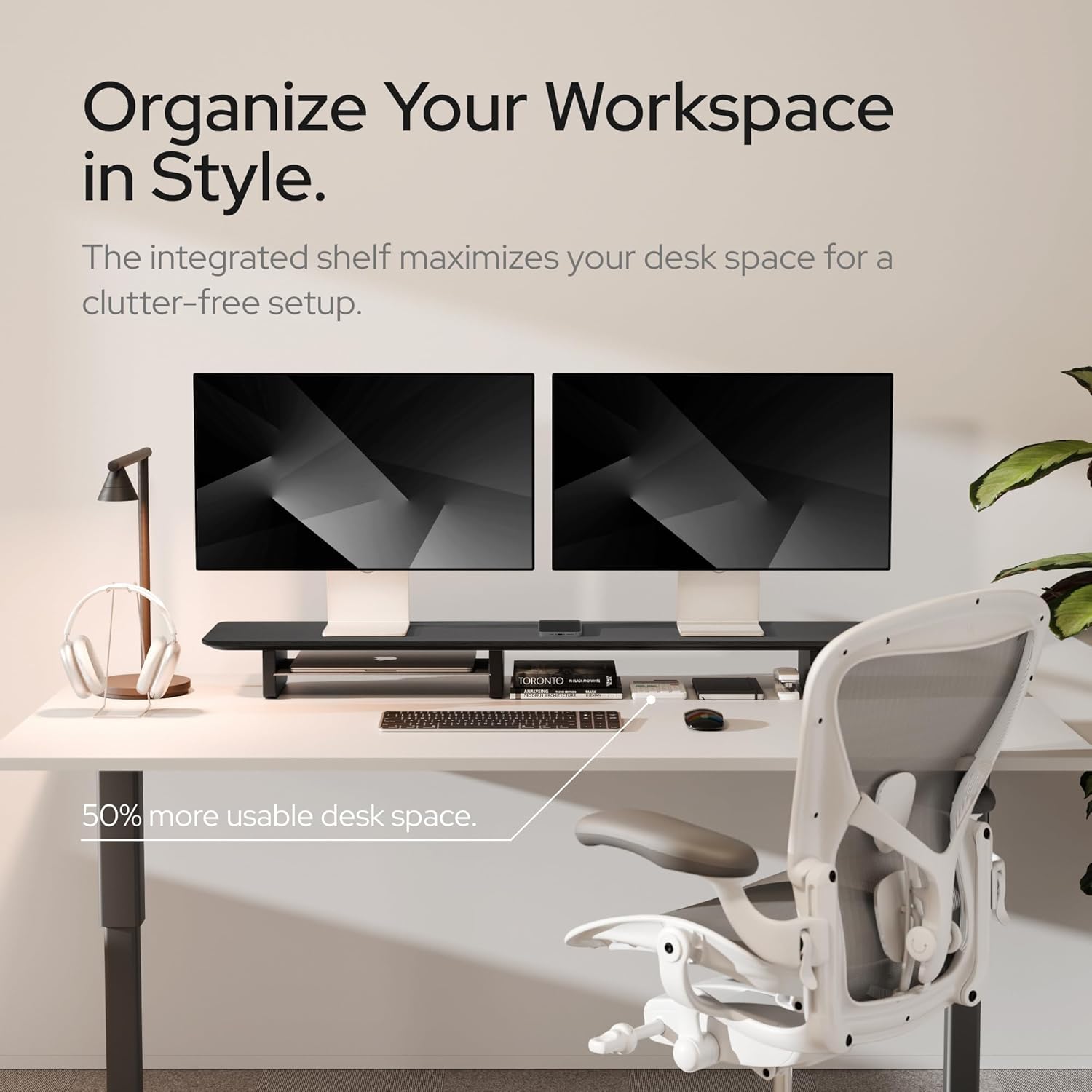 - INTEGRATED ALUMINUM SHELF: The dual monitor riser increases your usable workspace by up to 50%. Organize your office essentials with ease using this elegant desk shelf.