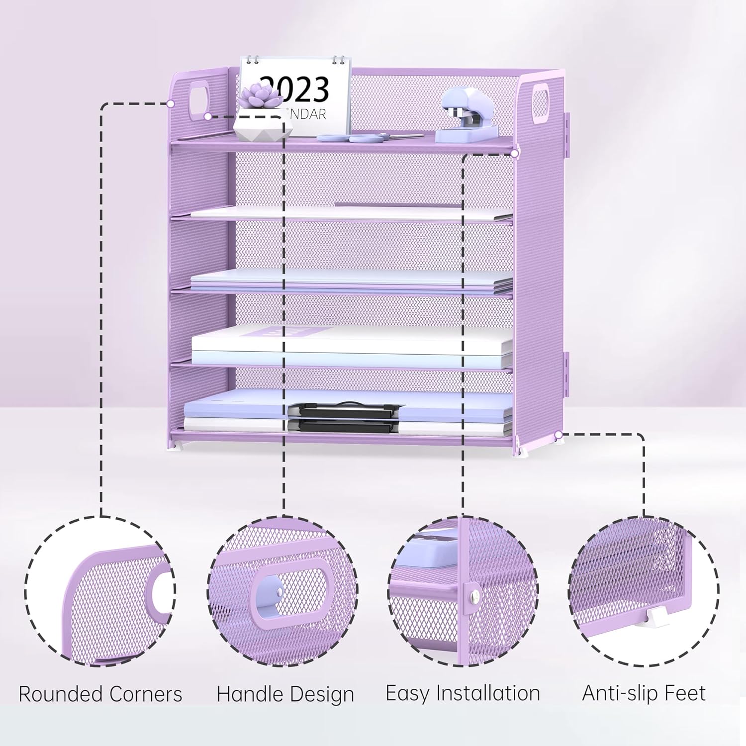 - [Handle Design] The handle design makes the paper tray organizer easy to move. These purple desk organizer are suitable for women, students, office clerks, teachers, and teens, offering both functionality and aesthetic pleasure.