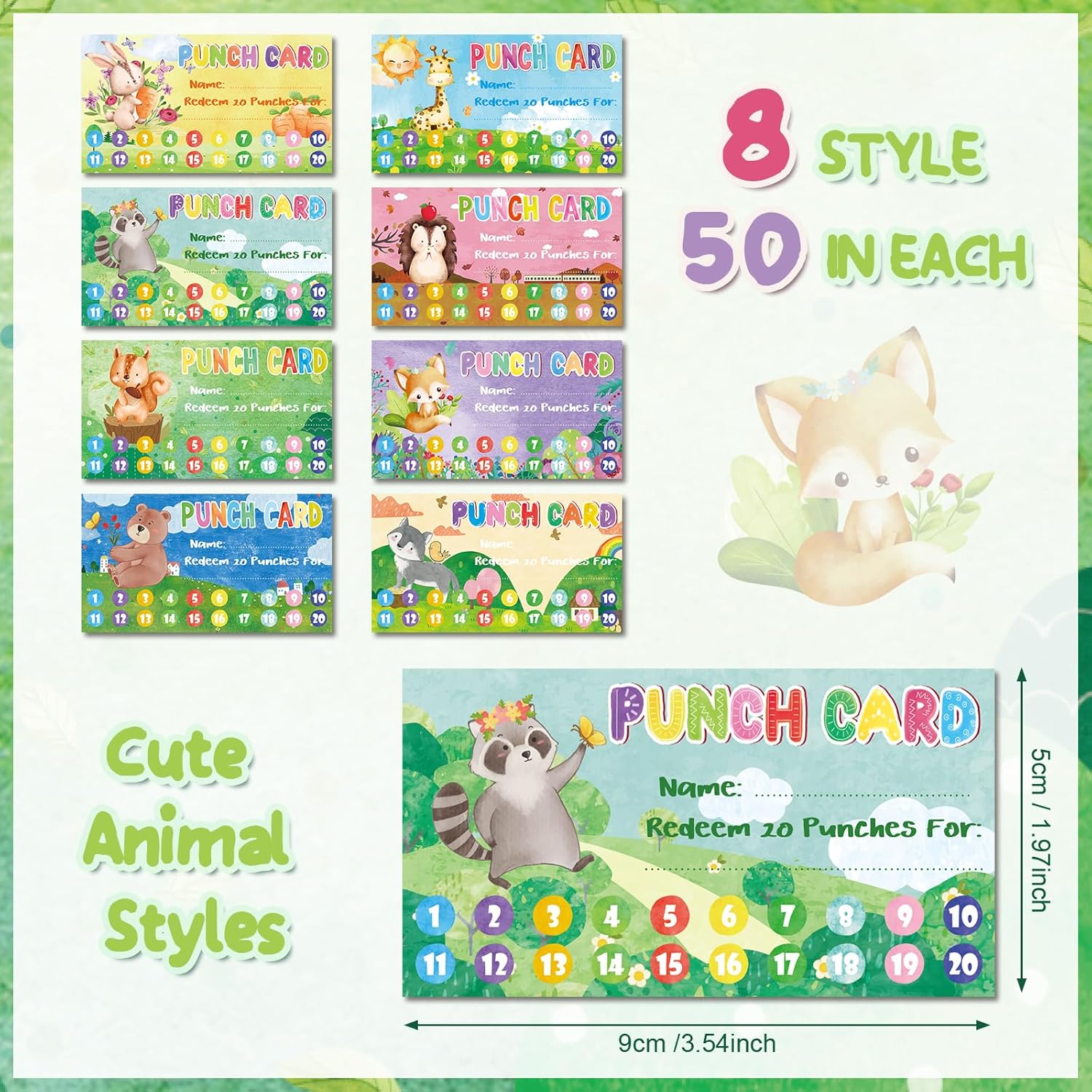 Fumete 400 Pcs Punch Cards for Classroom Reward Cards Behavior Incentive Loyalty Awards for Kids Students Teachers School Business, 8 Styles, 3.5 x 2 in(20 Cute Animal Punches Style)