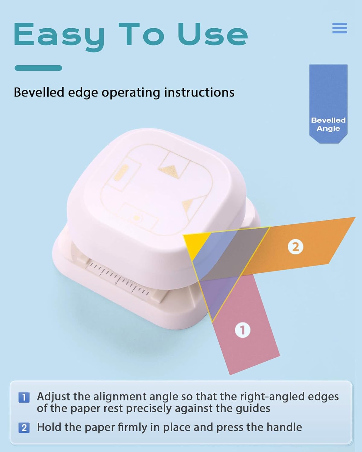 - Easy to Use - The paper hole puncher and corner cutter is simple to use. When you want to use the bevelled angle paper hole punch, you must remember to push the corner of the paper in until both right-angled edges of the paper rest precisely against the guides, then hold the paper firmly in place and press the handle. For the other three directions corner, just fix the right size paper right in the middle and cut. (Attention: Please use 100g-300g paper jam.)