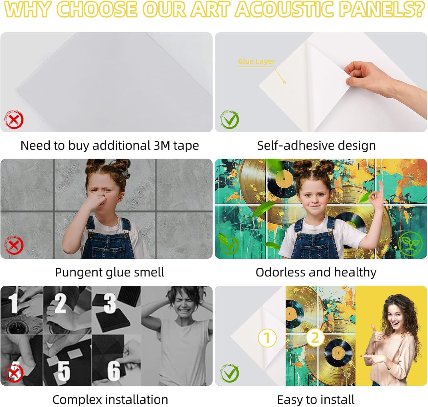 - HIGH DENSITY AND ECO-FRIENDLY: Decorative acoustic panels are made of 100% high-quality polyester fiber, recyclable, insulation, flame retardant, odorless and fade resistant. Can be widely used in recording studios, home theaters, and offices. They can be mounted on walls or ceilings, and overall size (48"x32"x0.4") provides ample coverage.