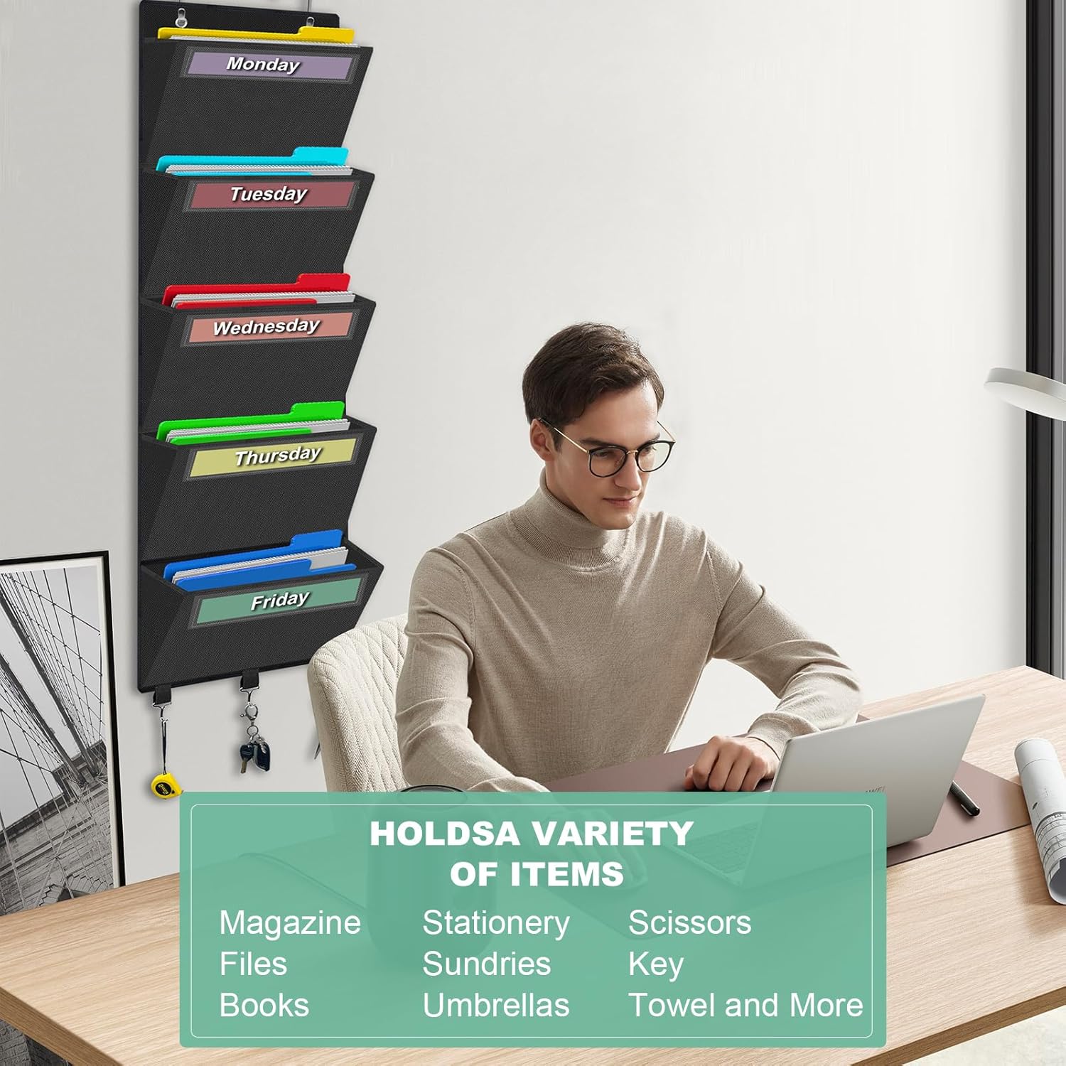 - 👍【5 Practical Hooks】: On top of these wall file organizers, there are 2 big hooks for hanging over the door or mounted on the wall, on bottom there are also 3 small hooks for hanging small stuffs, such as keys, scissors, measuring tapes,etc.