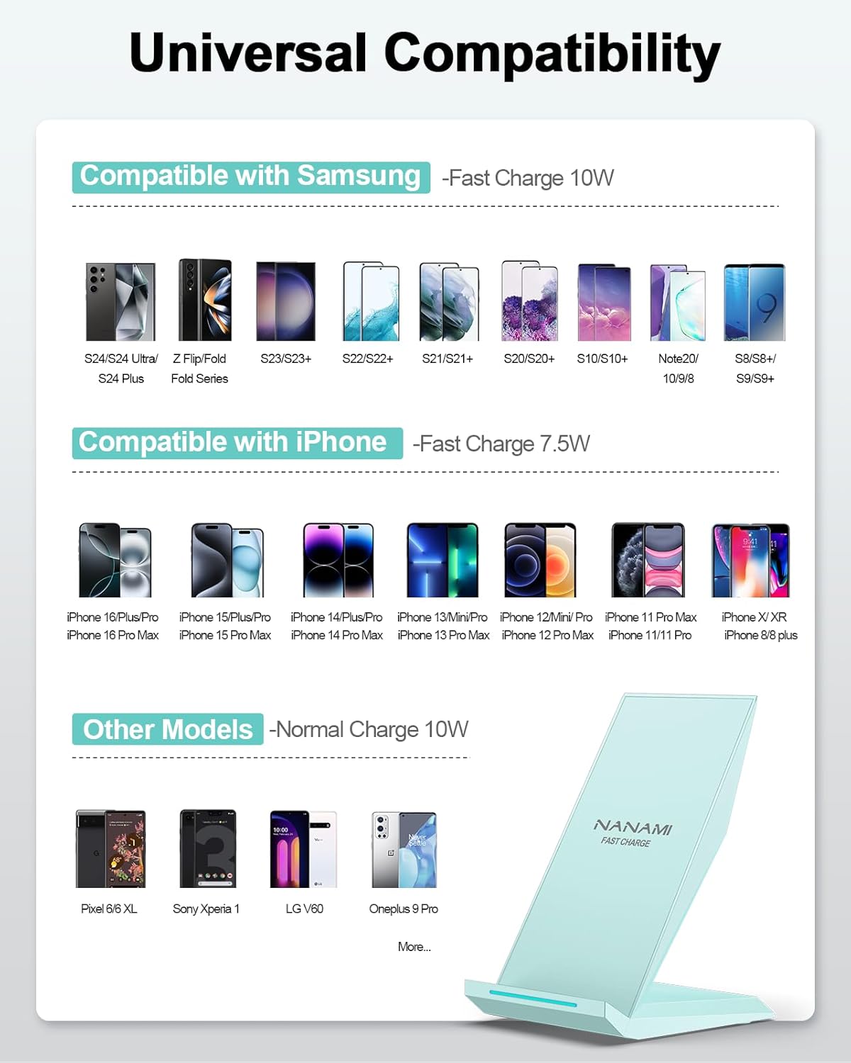 NANAMI Wireless Charger - Fast Wireless Charging Stand Desktop Charger Dock for iPhone 17/17 Air/16/15/14/13/12, 10W for Samsung Galaxy S25/S24/S23/S22/S21/S20/Note 20 Ultra/10/9 and Qi-Enabled Phone