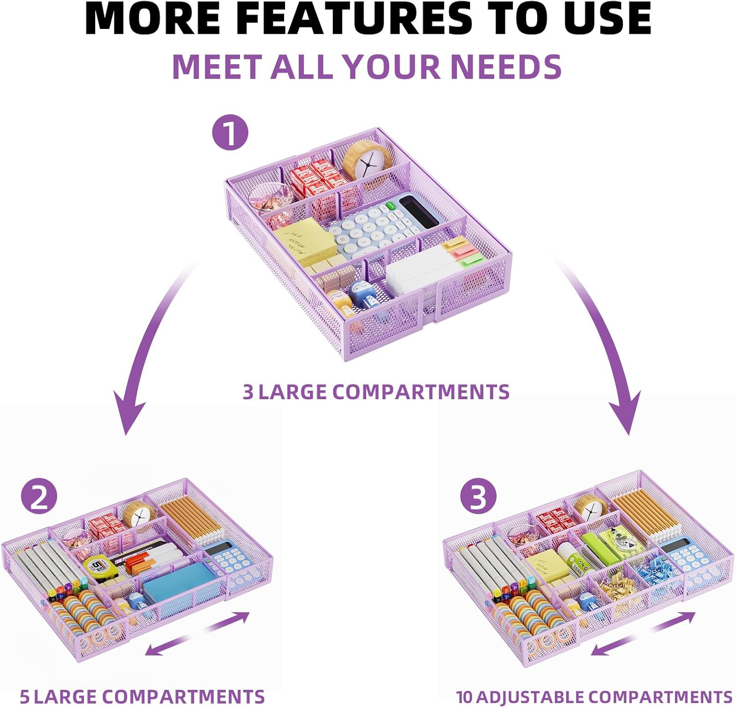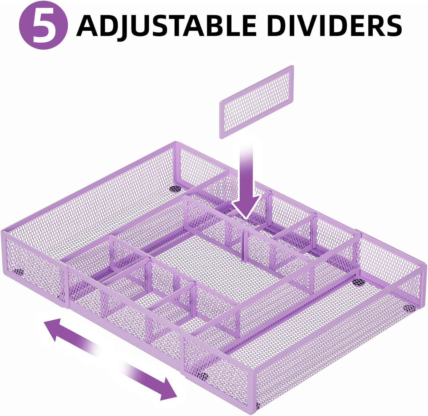 Marbrasse Expandable Desk Drawer Organizer, Mesh Drawer Organizer Tray with 10 Adjustable Compartments, Desk Organizers and Accessories for Office Supplies, Makeup & Vanity (Expandable-Purple)