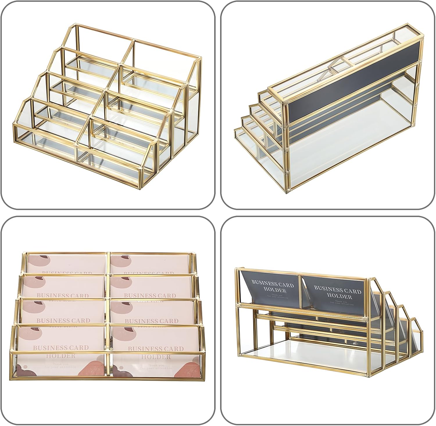 Hipiwe Mirrored Glass Business Card Holder Gold Business Card Display Stand for Desk Multiple Clear Business Card Holder Display for Office Desktop Cards Display Stand for Women Men, 8 Slots