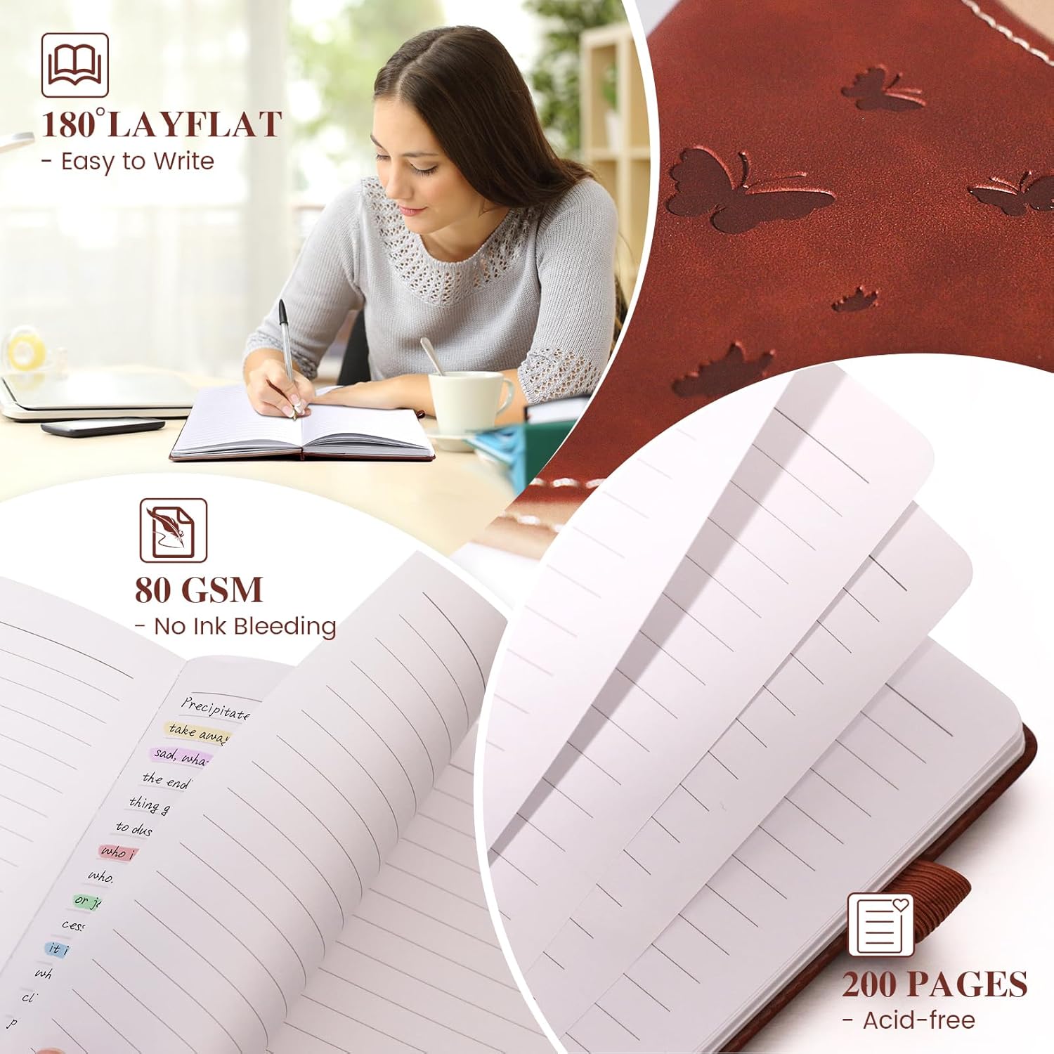 - 【180° Lay Flat Design】: Classic sturdy covers with Acid-free paper can be layed flat to 180 degree.After relaxing the binding a bit, it did lay perfectly flat, It is a comfortable writing experience.