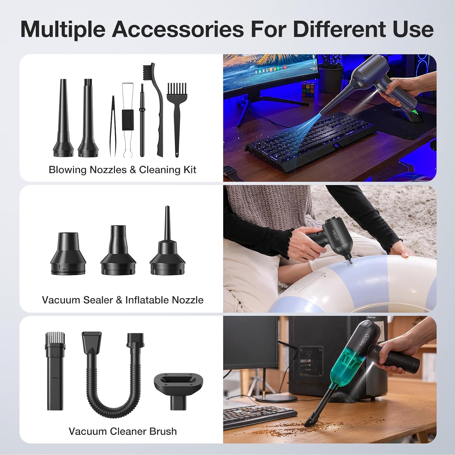 - 4in1 Design: In addition to effective vacuuming and cleaning, you can also use the compressed air duster to inflate swimming rings or air mattresses, or deflate storage bags to save space. Perfect solution to vacuuming, blowing, inflating, and pumping
