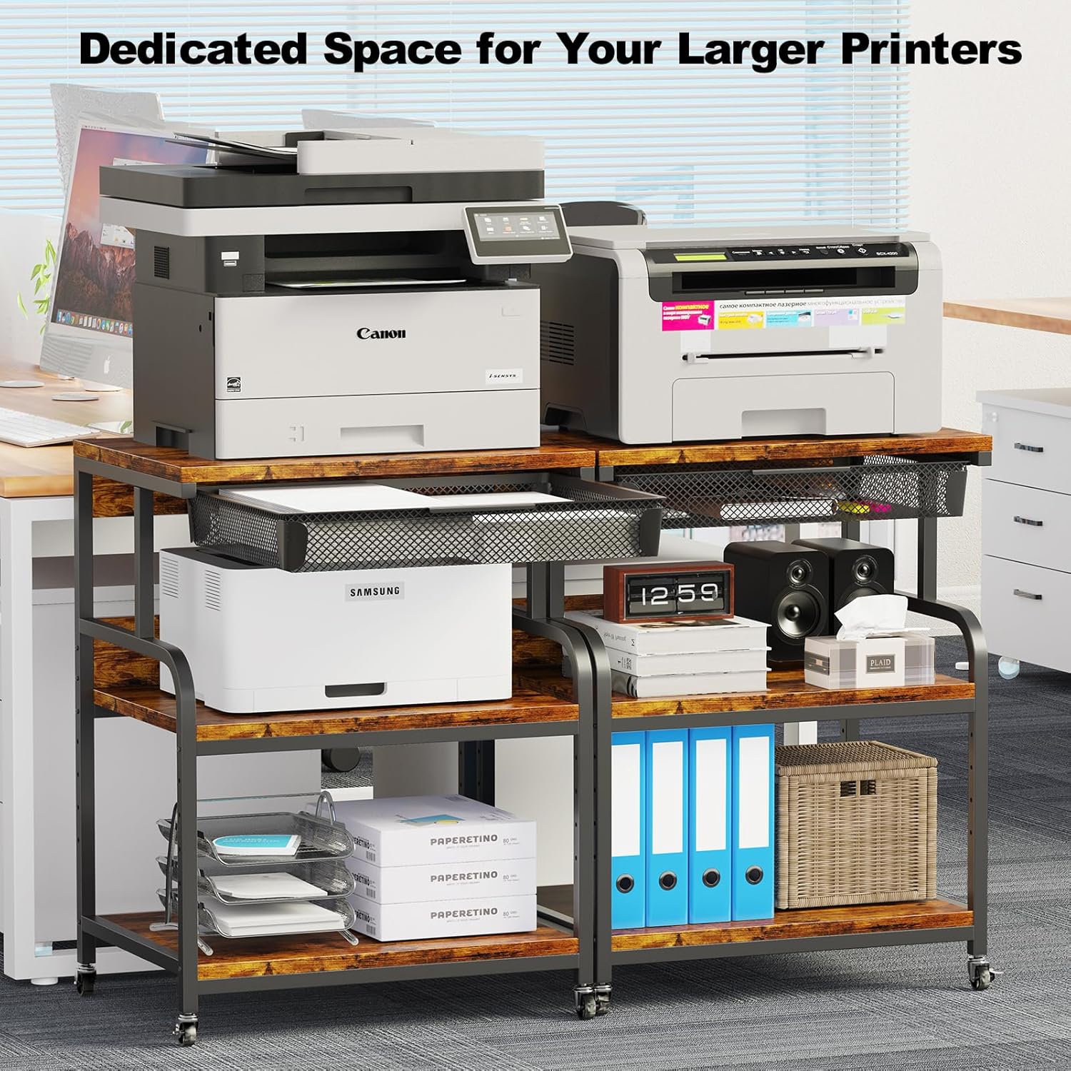 - Drawer Basket: The printer stand with drawer basket offers a dedicated space to store office supplies, such as paper, ink cartridges, cables, or other printer accessories. It allows you to keep these items within reach, reducing clutter on the desk or workspace.