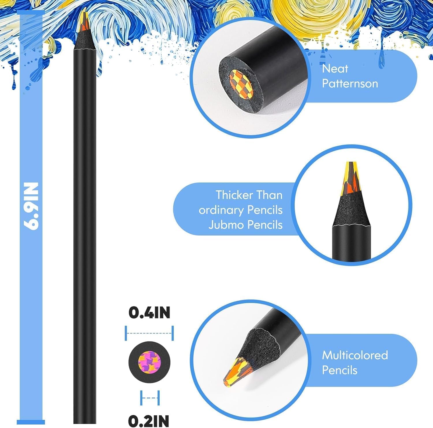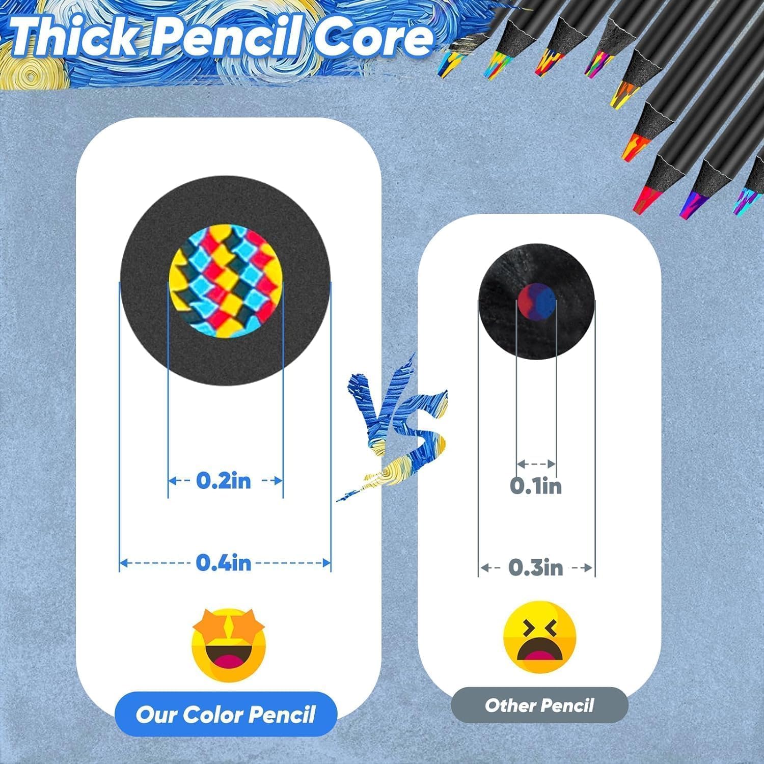 - Jumbo Coloring Pencils: Crafted from resilient ebony wood, our rainbow color pencils stand strong against breakage. Setting them apart from conventional options, these pencils feature a generously thick core, measuring 0.2 inches in diameter, much thicker than others. This enhanced core durability ensures a longer lifespan, while the 0.39-inch broader shaft of the pencil enhances your grip, providing optimal control for your artistic endeavors.