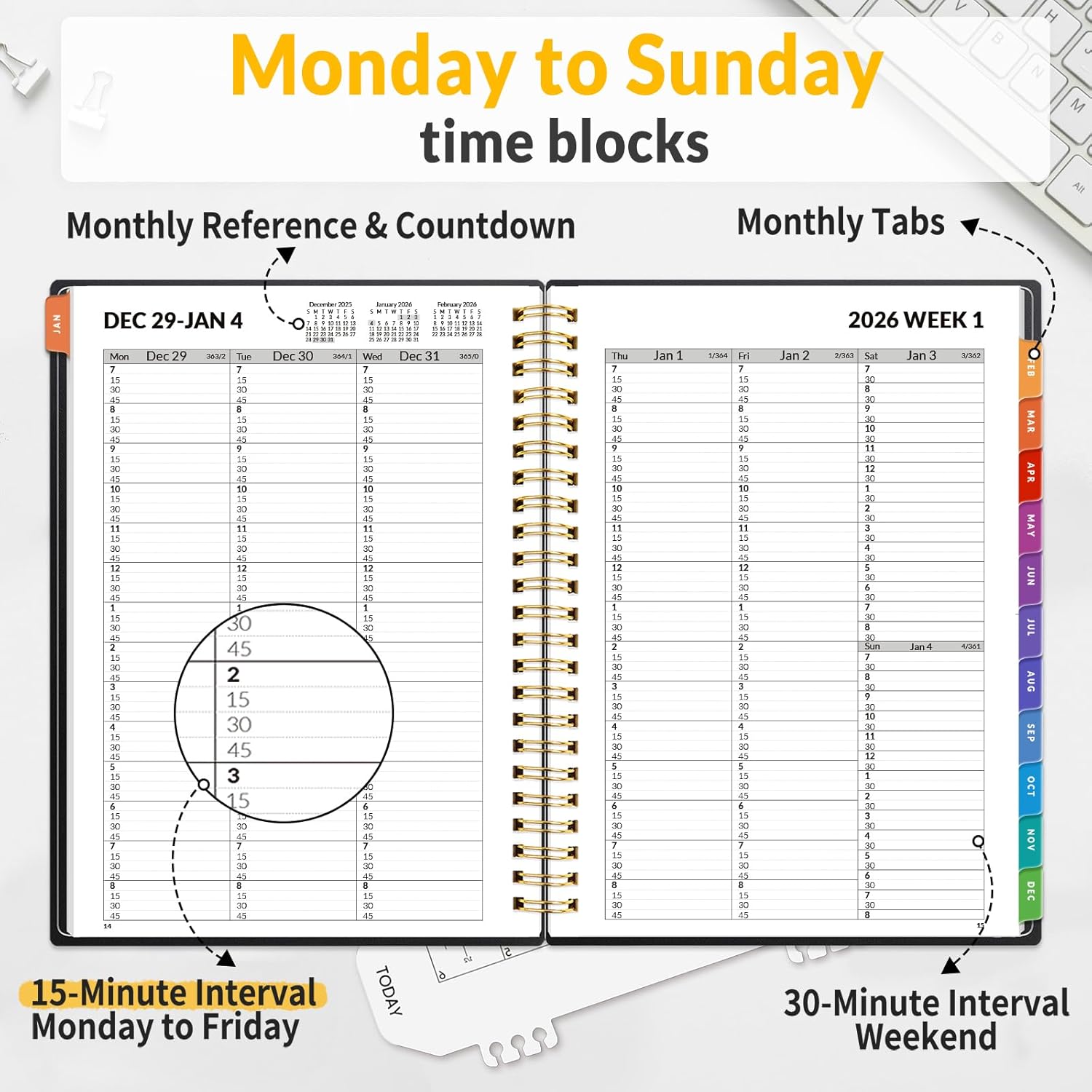SUNEE 2026 Appointment Book, Quarter-Hourly, Weekly & Monthly - from January 2026 - December 2026, 6.4"x8.3" Weekly Planner, Flexible Cover, Note Pages, Pockets, Bookmark, Spiral Binding, Black