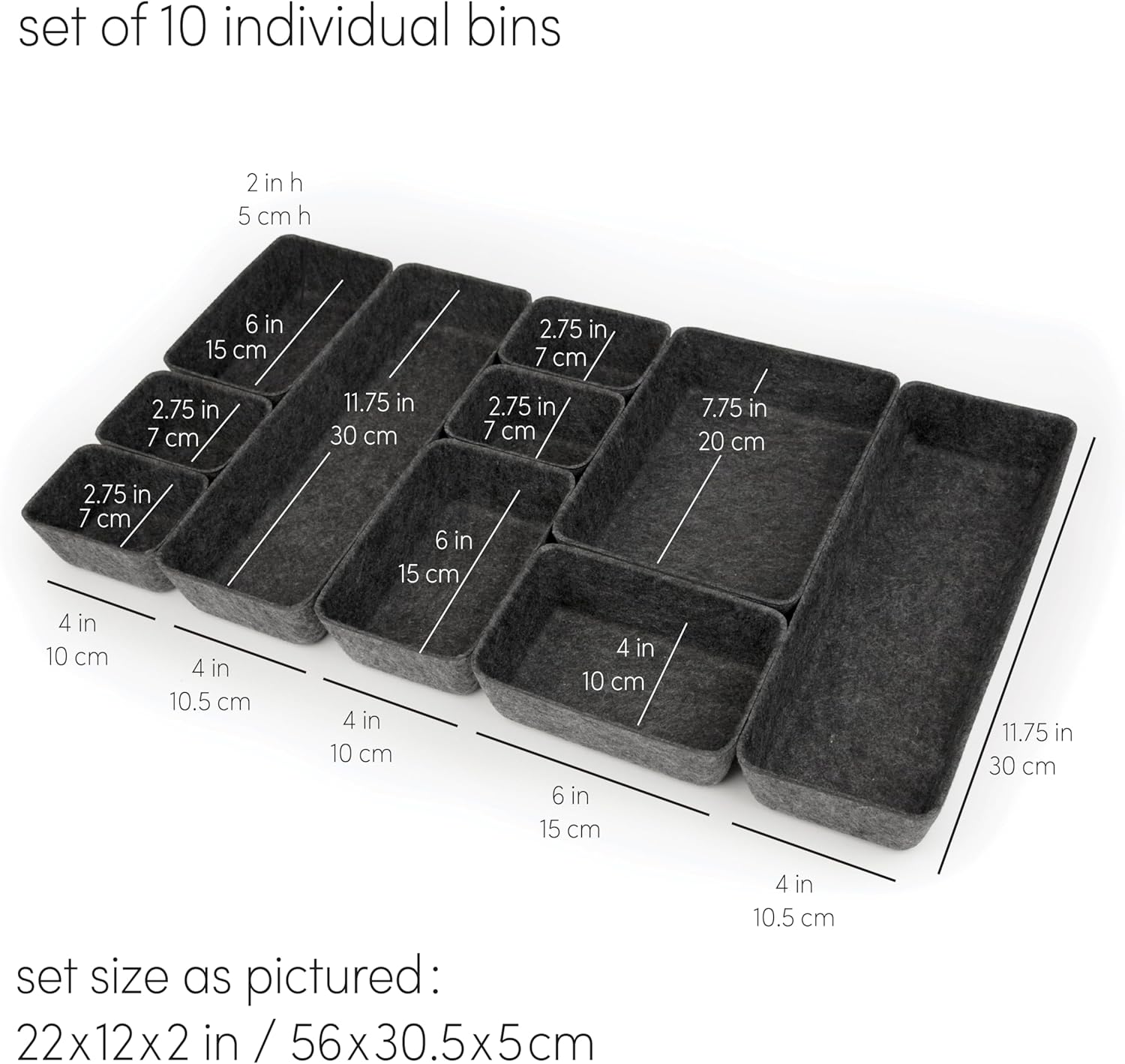 - Set includes: 4 of 4 × 2.75 × 2 in (10 × 7 × 5 cm), 3 of 6 × 4 × 2 in (15 × 10 × 5 cm), 7.75 × 6 × 2in (20 × 15 × 5 cm), 2 of 11.75 × 4 × 2in (30 × 10.5 × 5 cm)