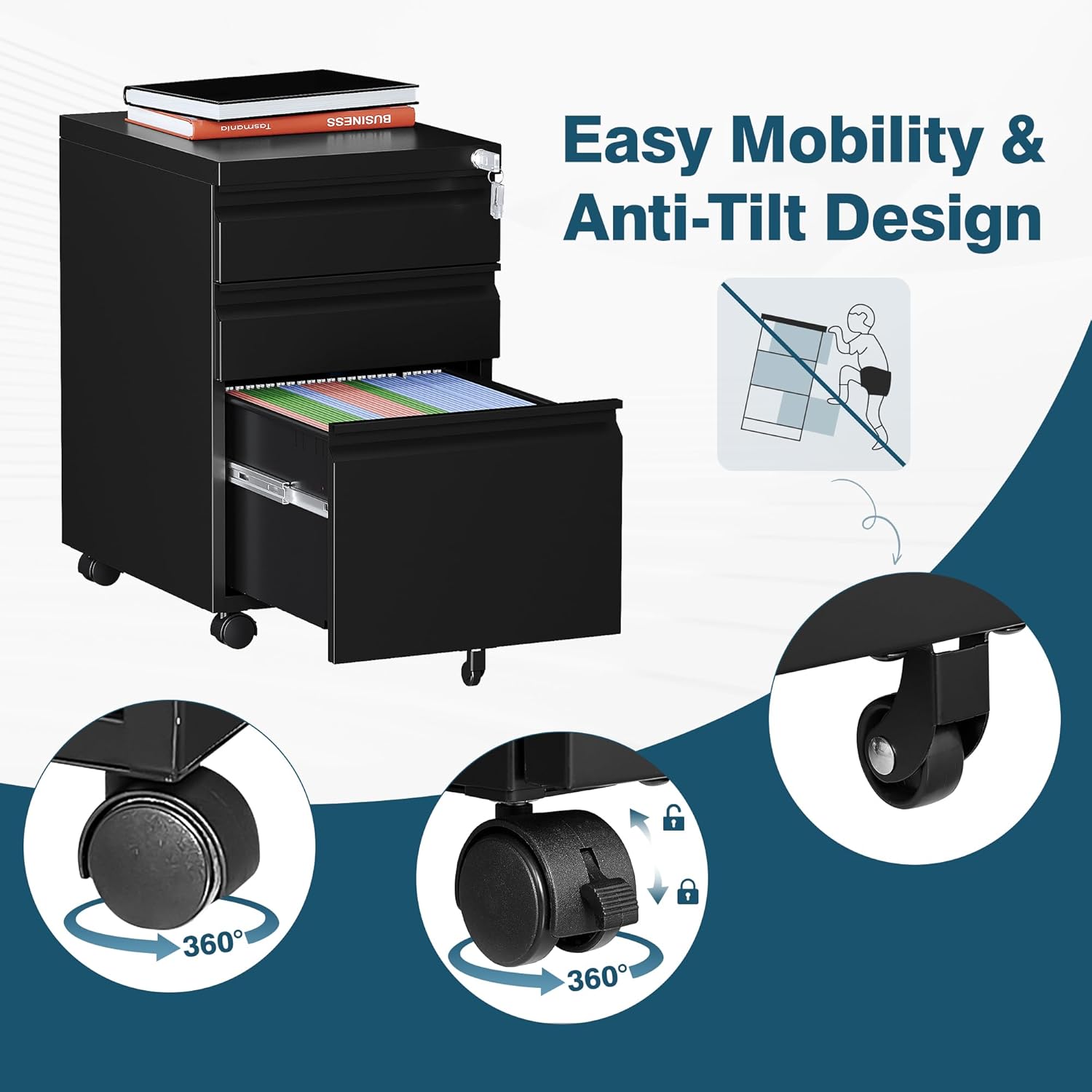 - 【Small Rolling Cabinet 】: Equipped with 2 lockable casters + 2 x 360° swivel casters + 1x anti-tilt wheel, you can move it easily. 360° swivel casters go to any direction easily, while lockable casters offer braking and the center support wheel prevents tipping.