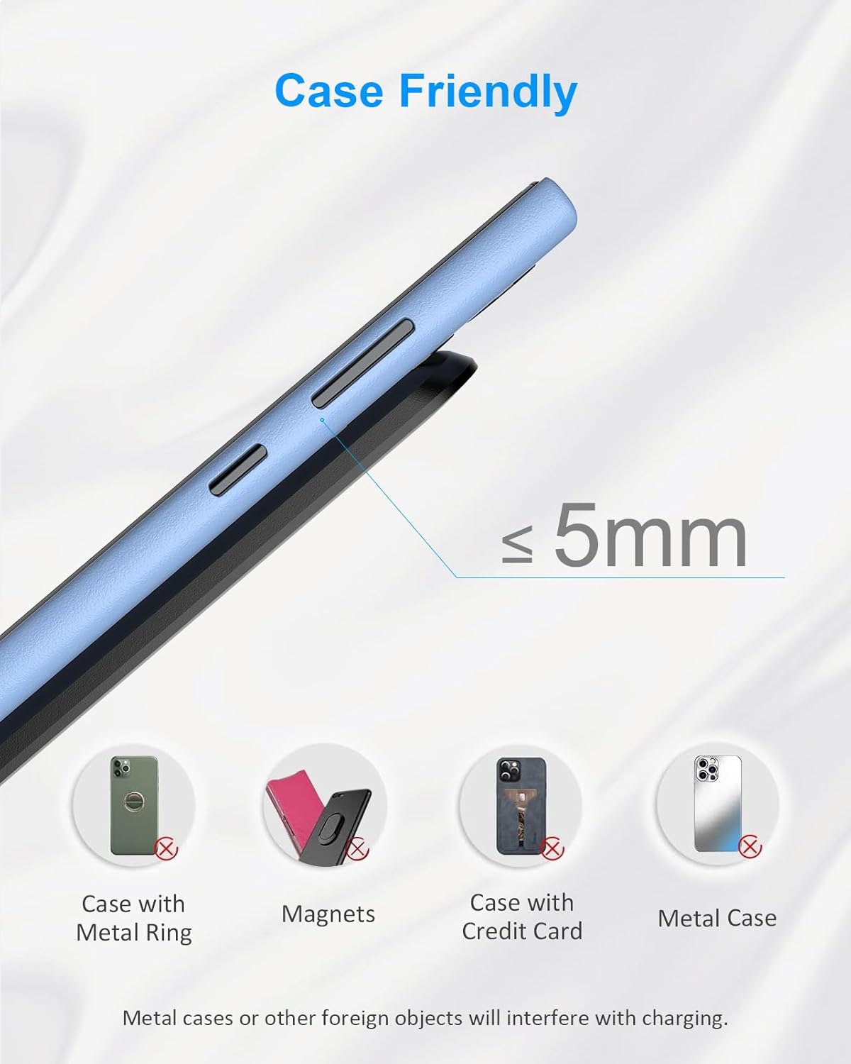 - [Sleep Friendly] Its LED indicator will automatically shut off after 10 seconds for your sweet sleep. Warm Notice: Supports rubber/plastic/TPU cases less than 5 mm thick only. Magnetic and metal attachments or cards will prevent charging