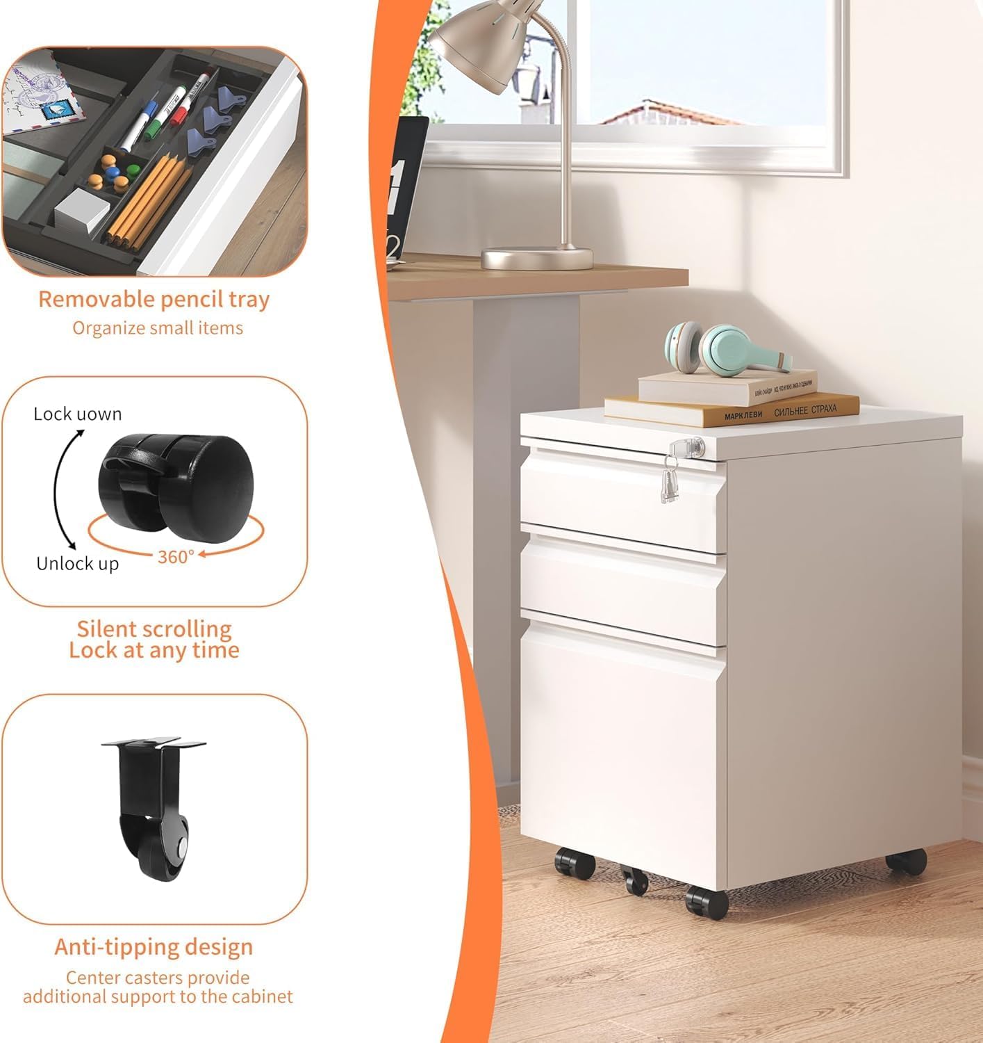 3 Drawer File Cabinet with Lock, File Cabinets for Home Office,Under Desk Cabinet, Locking File Cabinet for A4/Letter/Legal, Fully Assembled Expect Casters, Matte White