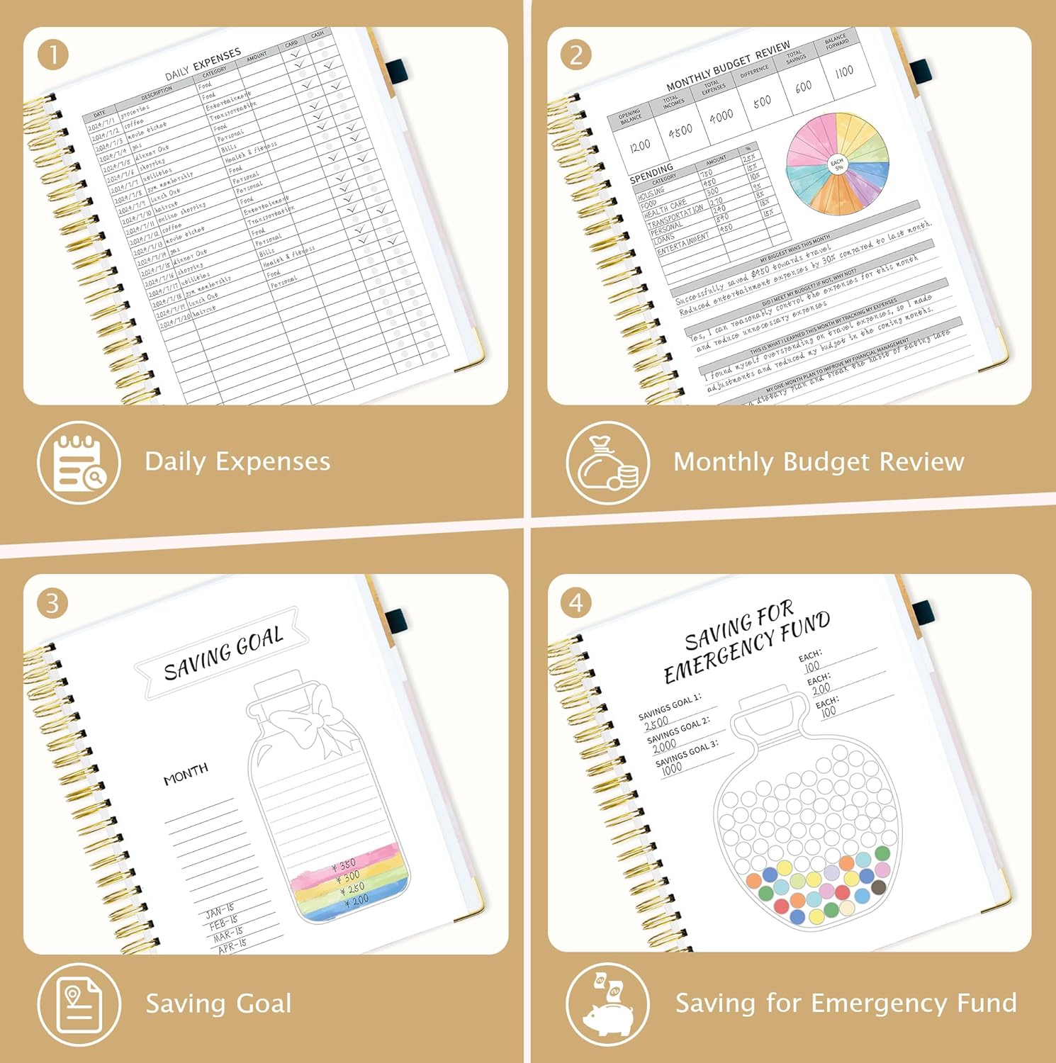 - Achieve Your Financial Goals Easily:Set your annual financial goals and budget plan, then track monthly & daily expenses by category and summarize monthly achievements though monthly budget review page.