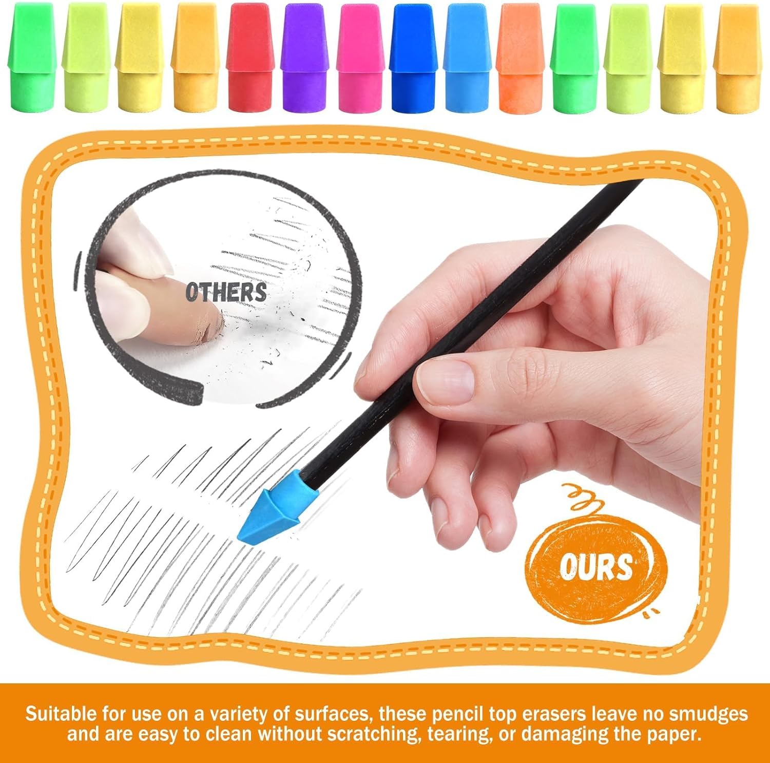 - The pencil top erasers bulk have no scratching or tearing of paper, they have soft feel.Perfect for school exams, essays, and everyday writing. Art projects and so much more.