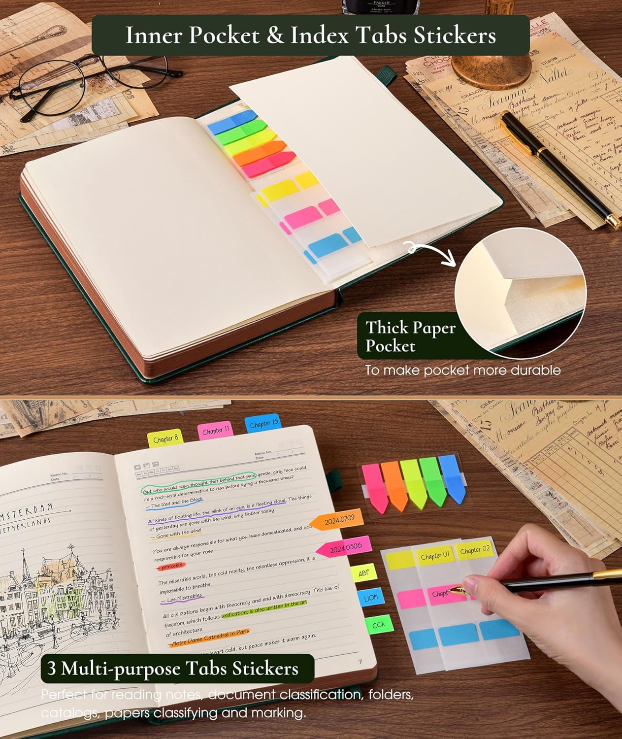 - 【BUILT-IN FEATURES FOR CONVENIENCE】This journal notebook comes with several useful features.The 1 built-in back pocket is ideal for storing loose papers or small items. The 1 elastic pen holder keeps your pen handy at all times.The 2 elastic closures ensure that the notebook stays securely closed.Additionally, the 3 colored ribbon bookmarks help you easily find your place.And the 3 free sticky tabs are great for marking important sections.