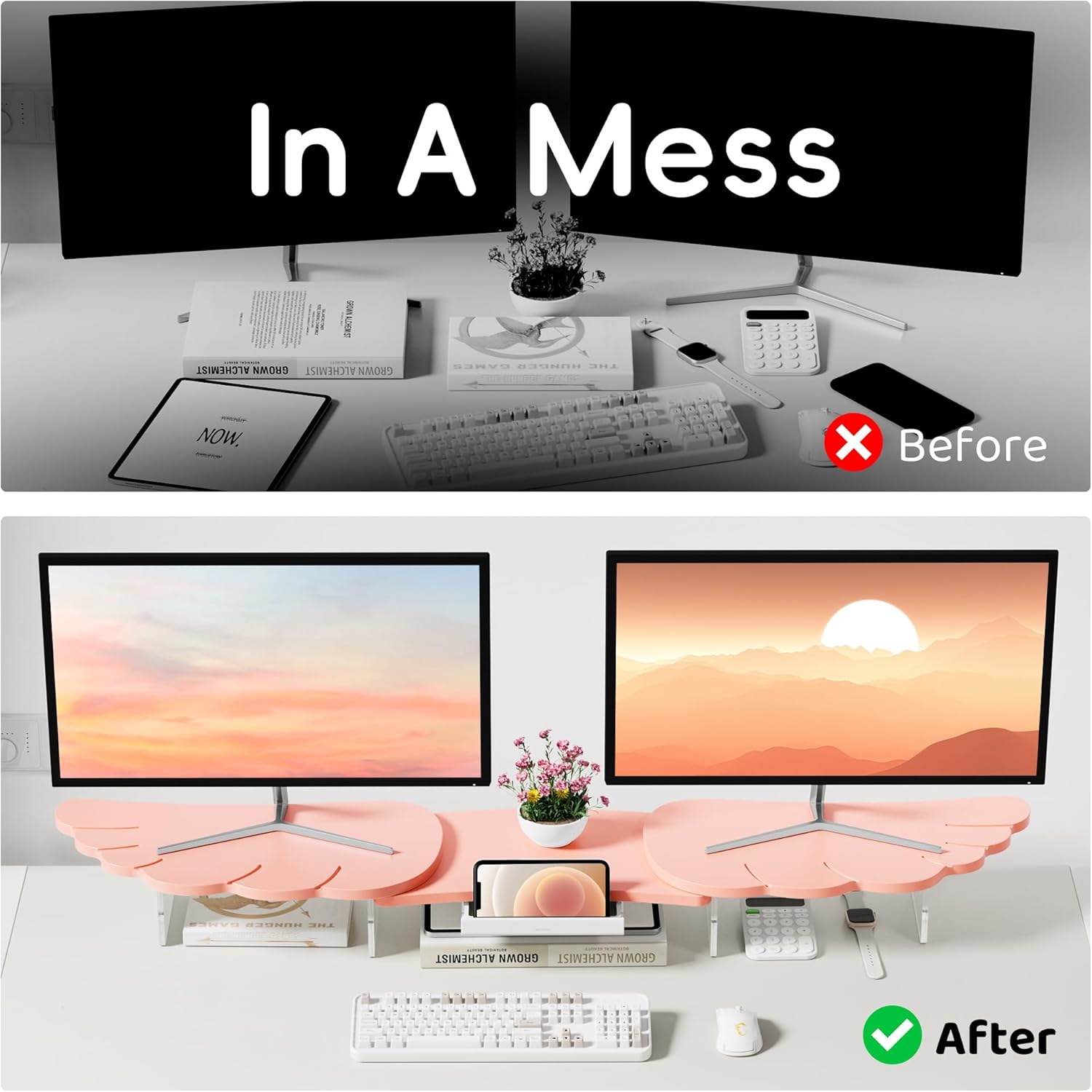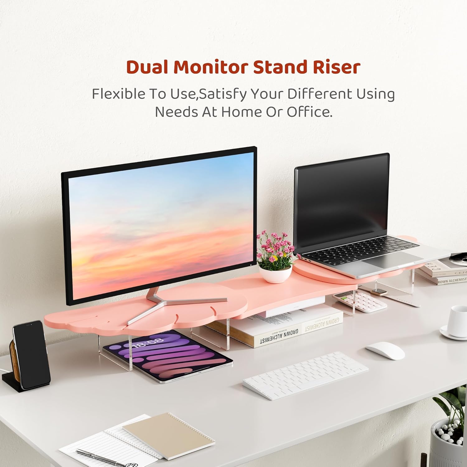 Dual Monitor Stand Riser,Wing-Shaped Sturdy Desktop Computer Wood Stand for 2 Monitors Cute Monitor Riser for Laptop, PC, Computer,Pink
