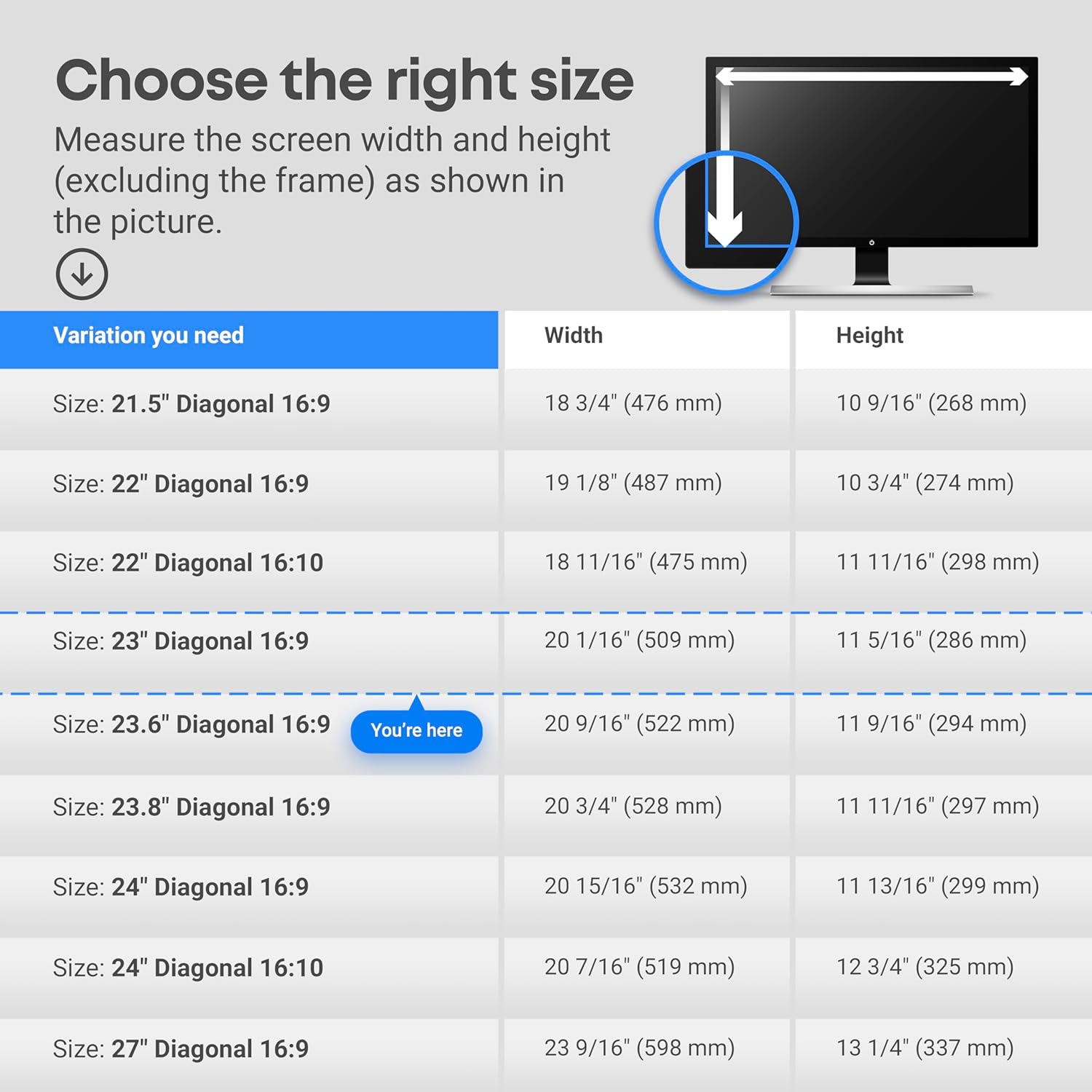 - Ideal Fit: The blue light screen for monitor fits screens with the Width of 20 1/16 inches (20.0 inches/509 mm), Height of 11 5/16 inches (11.3 inches/286 mm), and a 16:9 Aspect Ratio
