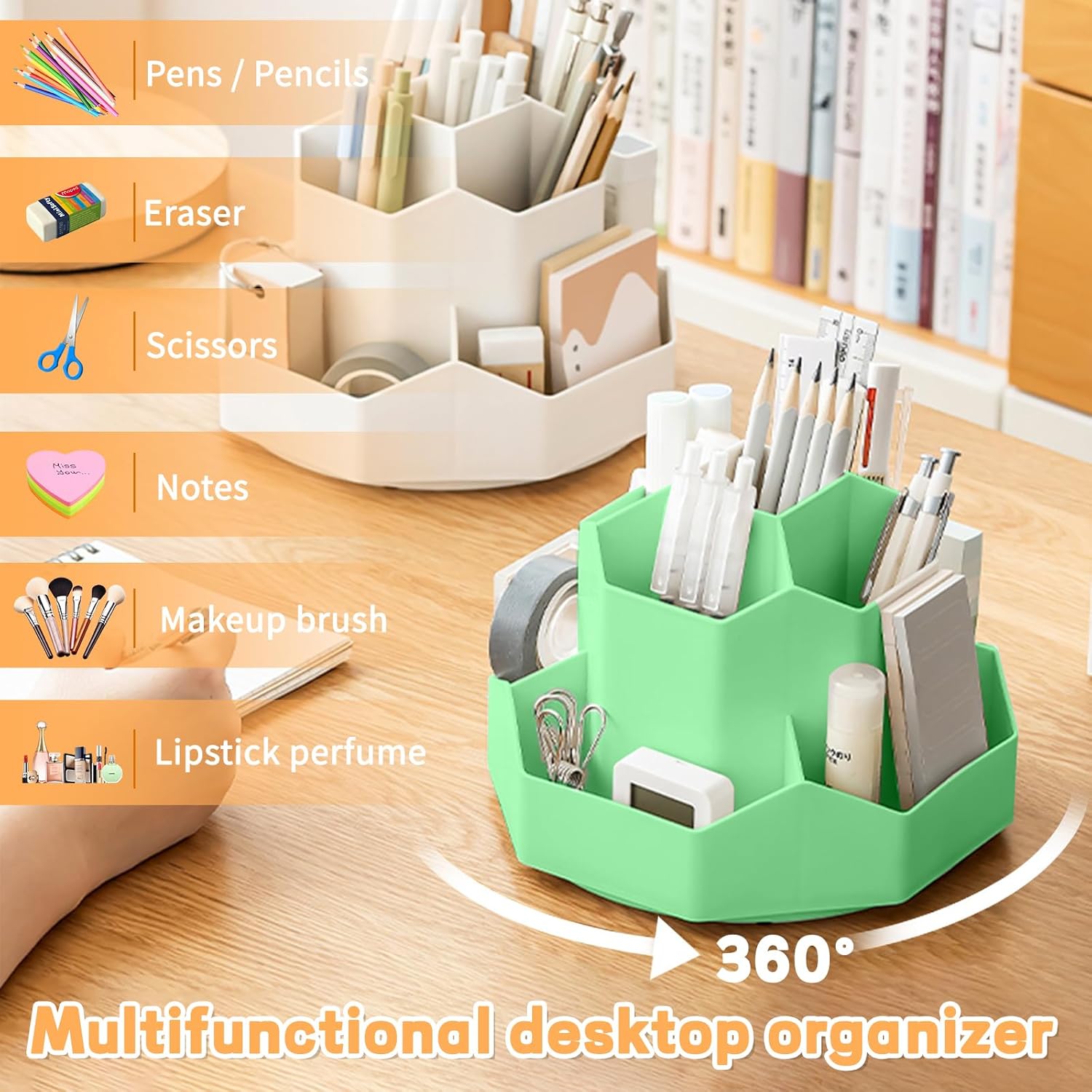 - ă360°Rotating Desktop OrganizerăThis desktop organizer can be turned up to 360-degree rotation to the left and right. You can rotate it to any angle to easily store or take out the things you want, it keeps your stationery supplies organized and easy to find, making you more productive