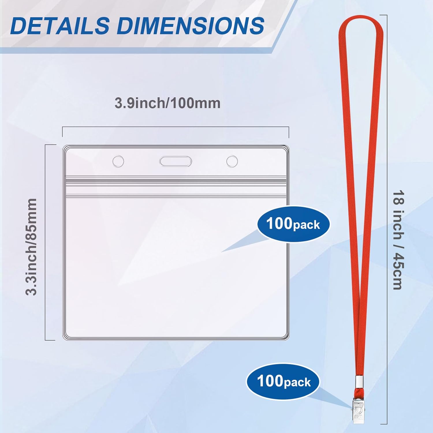 - Common Size: Each lanyard for ID badges measures 18 inch/ 45cm long in length. Horizontal Holder Size 100 x 85mm/ 3.9" x 3.3"(L*W) . Fit Card Size: 95 x 60mm/ 3.7" x 2.35" (L*W). Horizontal style suitable for a lot of ID cards