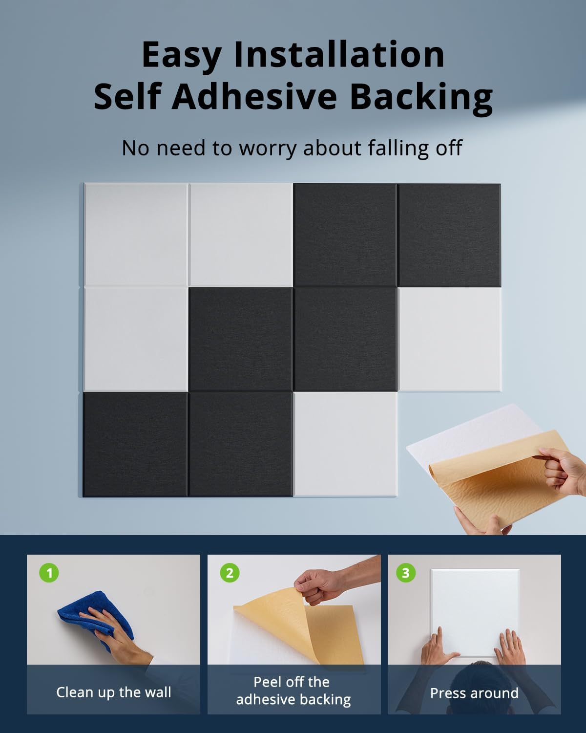 - Self-Adhesive & Easy Installation: Woovio soundproofing panels/wall soundproofing panels have a self-adhesive design, making installation quick and easy. Just clean the wall, peel off the back adhesive, and stick acoustic foam panels noise reducing on the wall to improve the soundproofing effect of the room, very convenient. You will love our self adhesive wall panels.