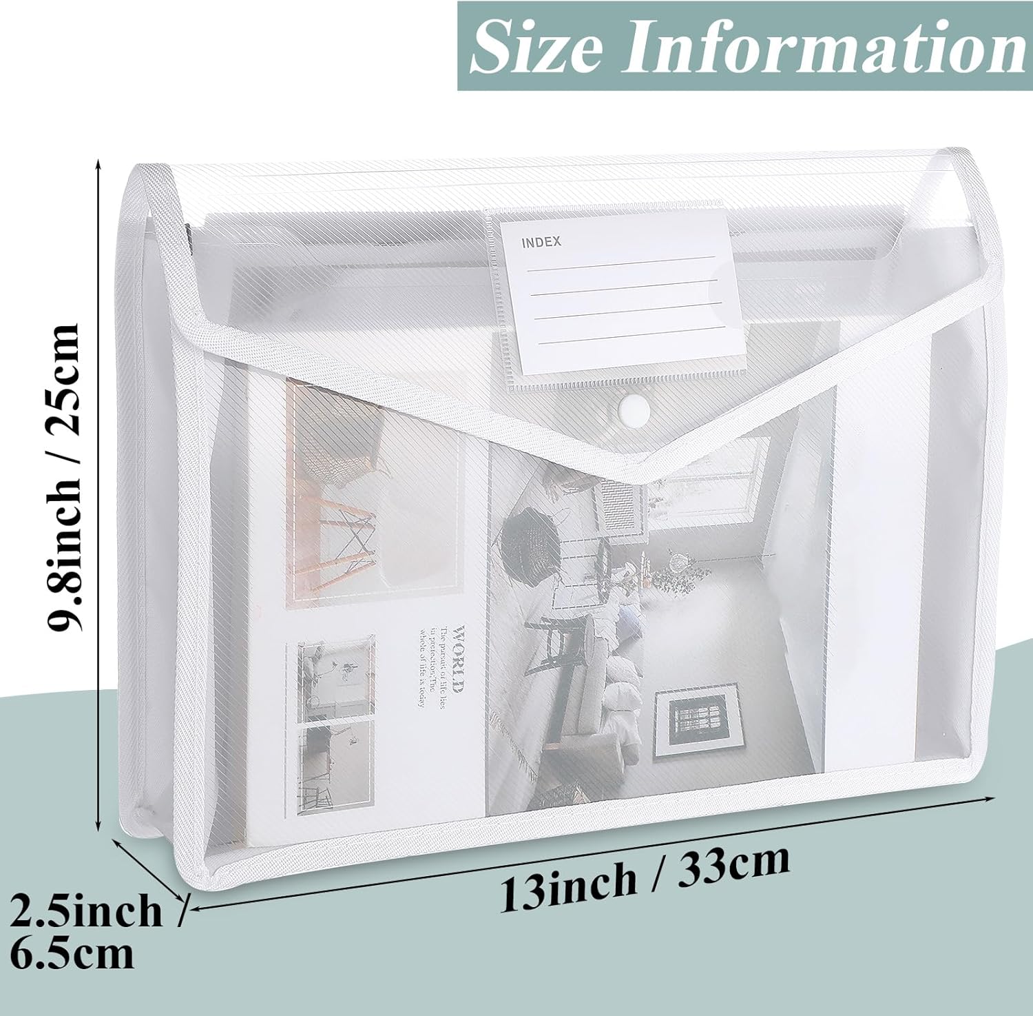 10 Pieces Plastic File Folders Envelope Expanding File Wallet Organizer Documents Folder with Snap Closure and Pocket, A4 Size Waterproof Transparent Pouch(White,Horizontal)