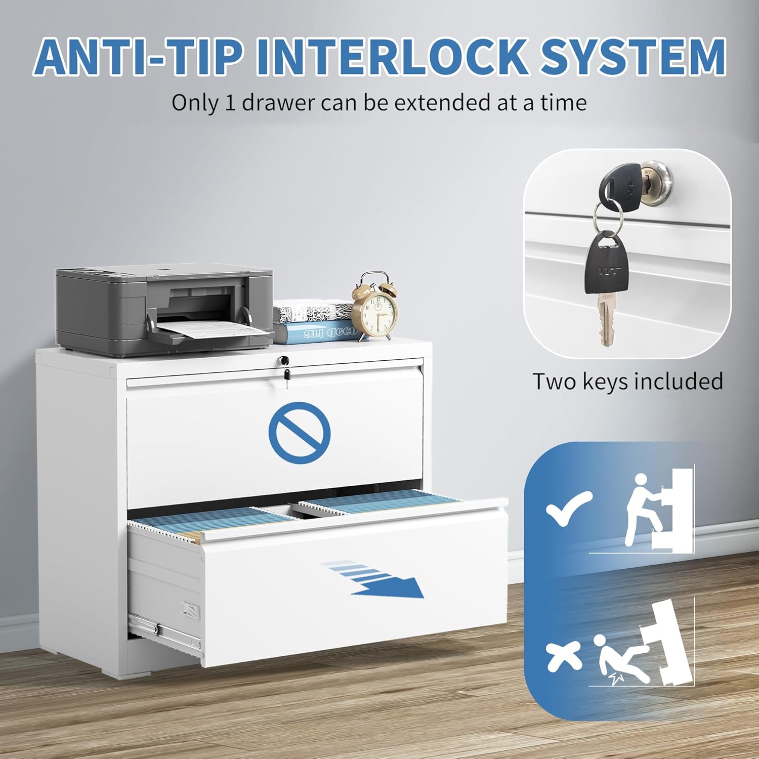 - ăEnhanced Safety Featuresă To prevent tipping hazards, FLIXELIO 2 drawer file cabinet with lock includes a built-in anti-tip mechanism that allows only one drawer to open at a time. This thoughtful design minimizes safety risks and ensures stability, even when multiple drawers are in use.