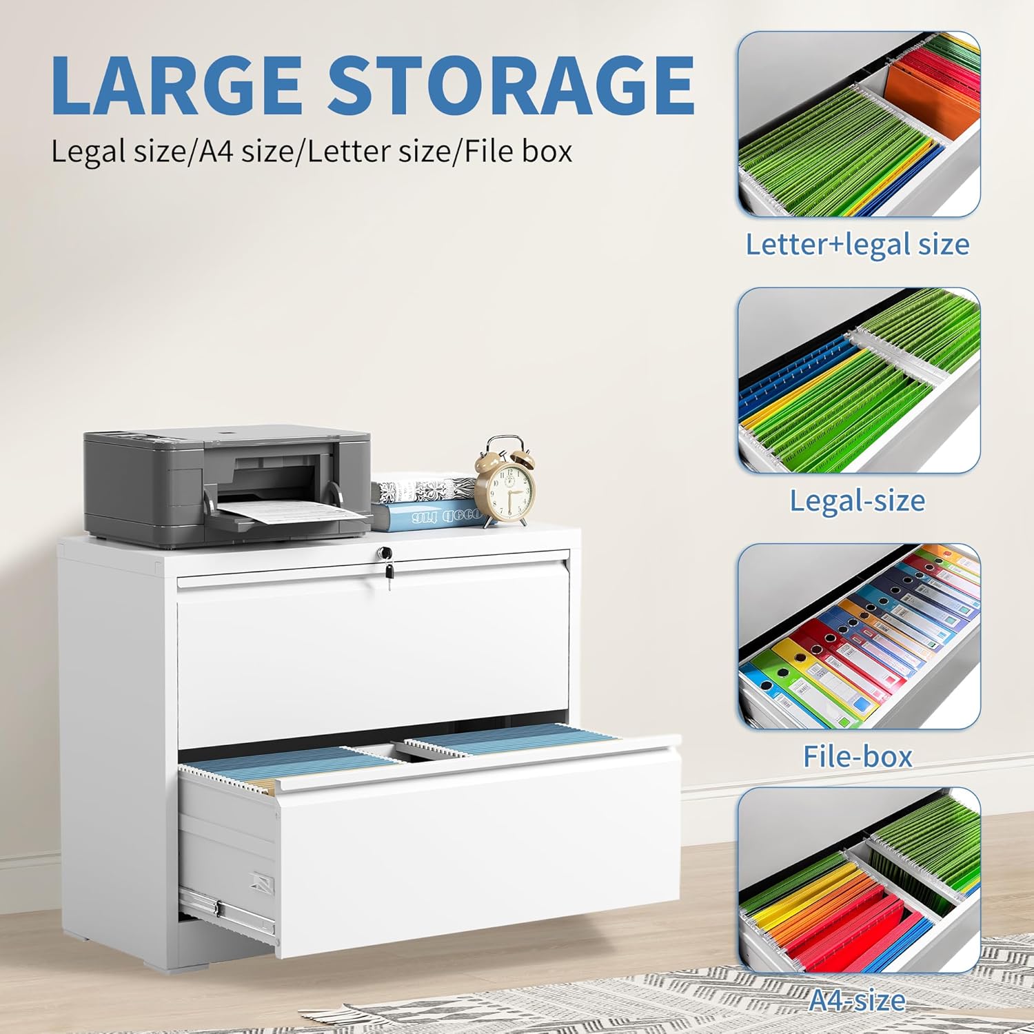 - ăVersatile Storageă This file cabinets for home office is designed for multiple uses. Each drawer comes with a hanger-on clip, accommodating legal, letter, and A4-sized documents or file boxes.