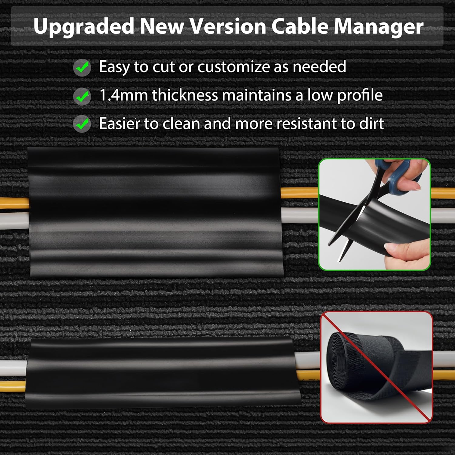 - Flexible and Easy to Use: Made of soft yet durable PVC material, this cable hider is easier to clean and more resistant to dirt than nylon versions. After being fastened to the carpet, it can be repeatedly opened or closed as needed, easy to disassemble without leaving adhesive residue, and allows for easy position adjustment anytime