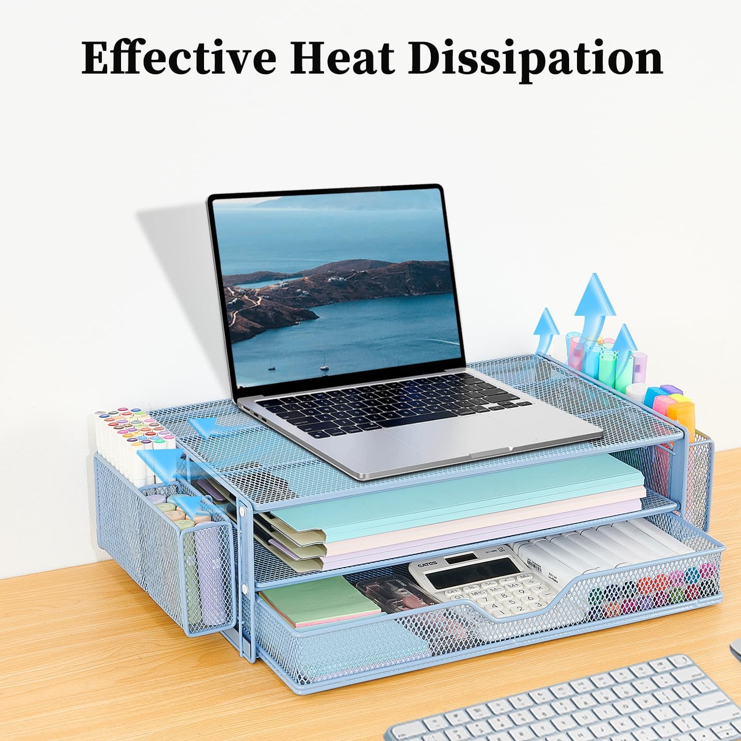 - Space Saving: Our dual-tier desktop organizer with drawer and 2 pen holders stores office supplies and office desk accessories neatly. As a purpose monitor riser, it keeps your workspace organized, helping you focus and work efficiently