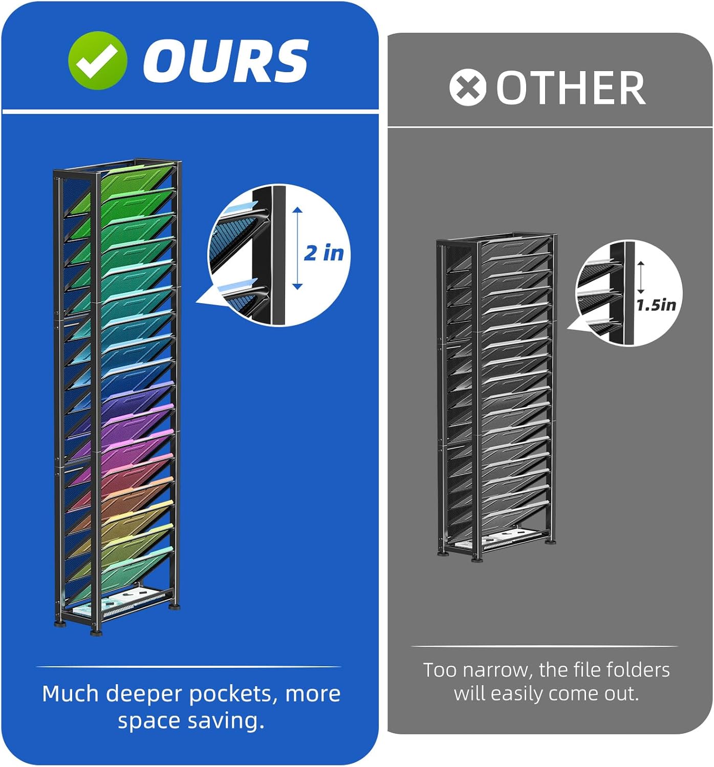 - 【18 Tier Large Capacity】This wall file holder measures 14.12”L x 5.27”W x 40.12”H, with 17 individual slanted slots for files, papers, magazines, books, and a flat tray at the bottom for sticky notes, staples, etc., which helps us to better categorize our files and improve work efficiency