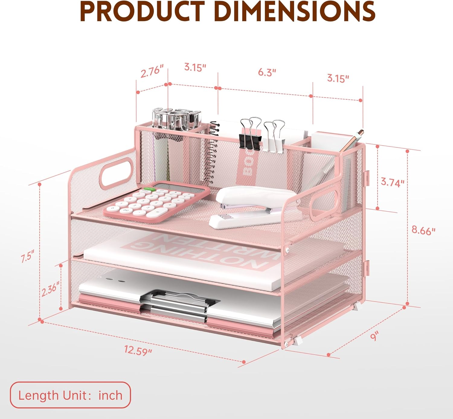 - 3 Trays & 3 Pen Holders: Supeasy cute pink desk organizers are multifunctional. This paper organizer provides 3 trays for organizing papers, letters, folders, files, books, mails, documents, etc. The pen holders on the top help organize your various pens, small notebooks, scissors and stapler. Our file organizer gives you large capacity for desk organization, keeping your office clean and tidy.