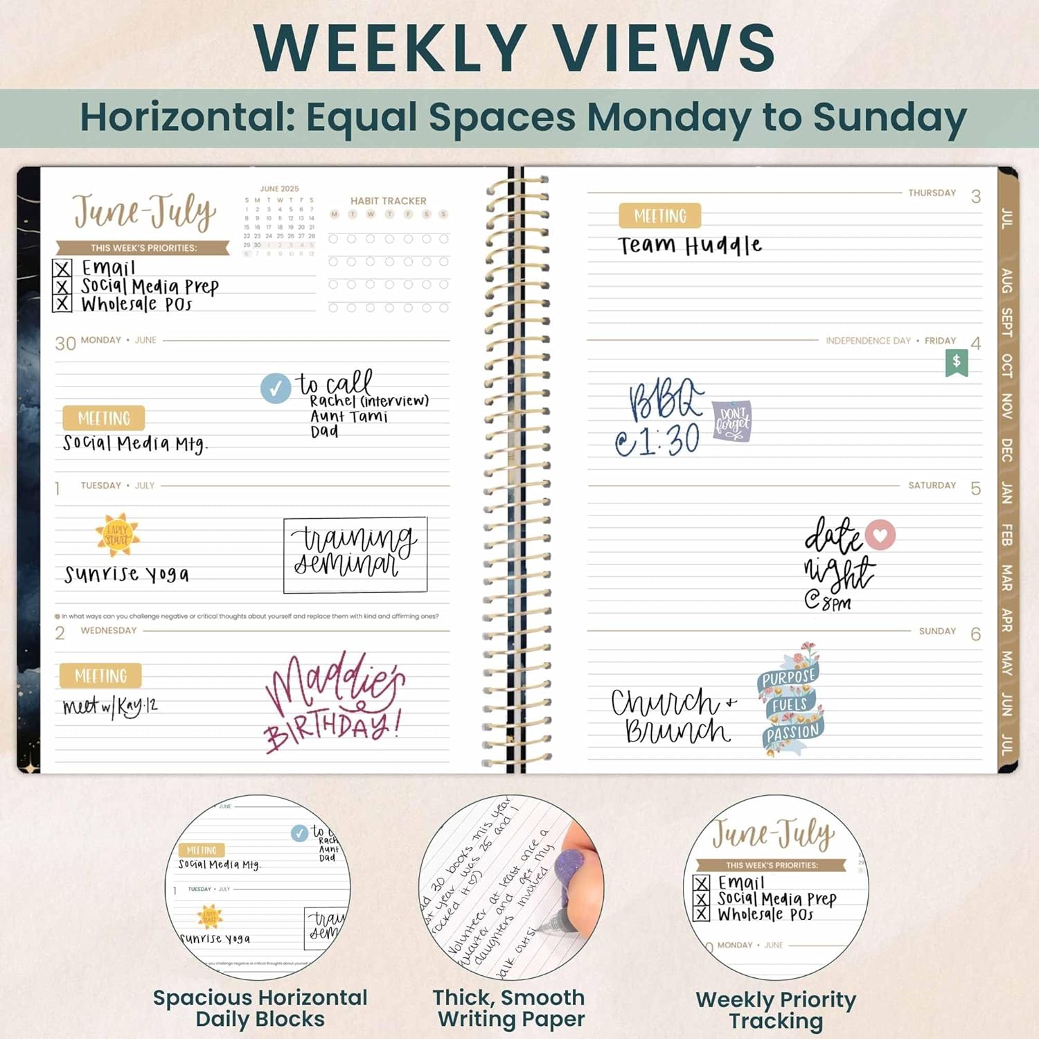 - 8.5” x 11” WITH HORIZONTAL WEEKLY LAYOUT & MONTHLY VIEWS: 2 page monthly overview spreads and spacious weekly views run Academic Year, July 2025 through July 2026. Weekly views are horizontal and include priority & habit tracking.