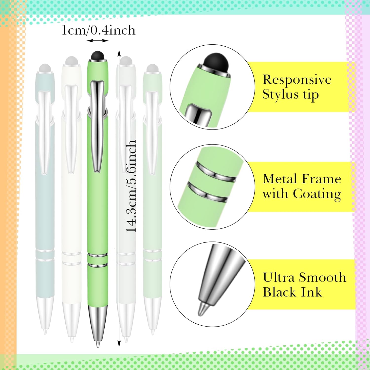 - Modern Nice Touch Metal Pens: these ballpoint pens have a responsive click action, bright finished barrel, matching colored capacitive stylus tip, and ultra smooth black ink