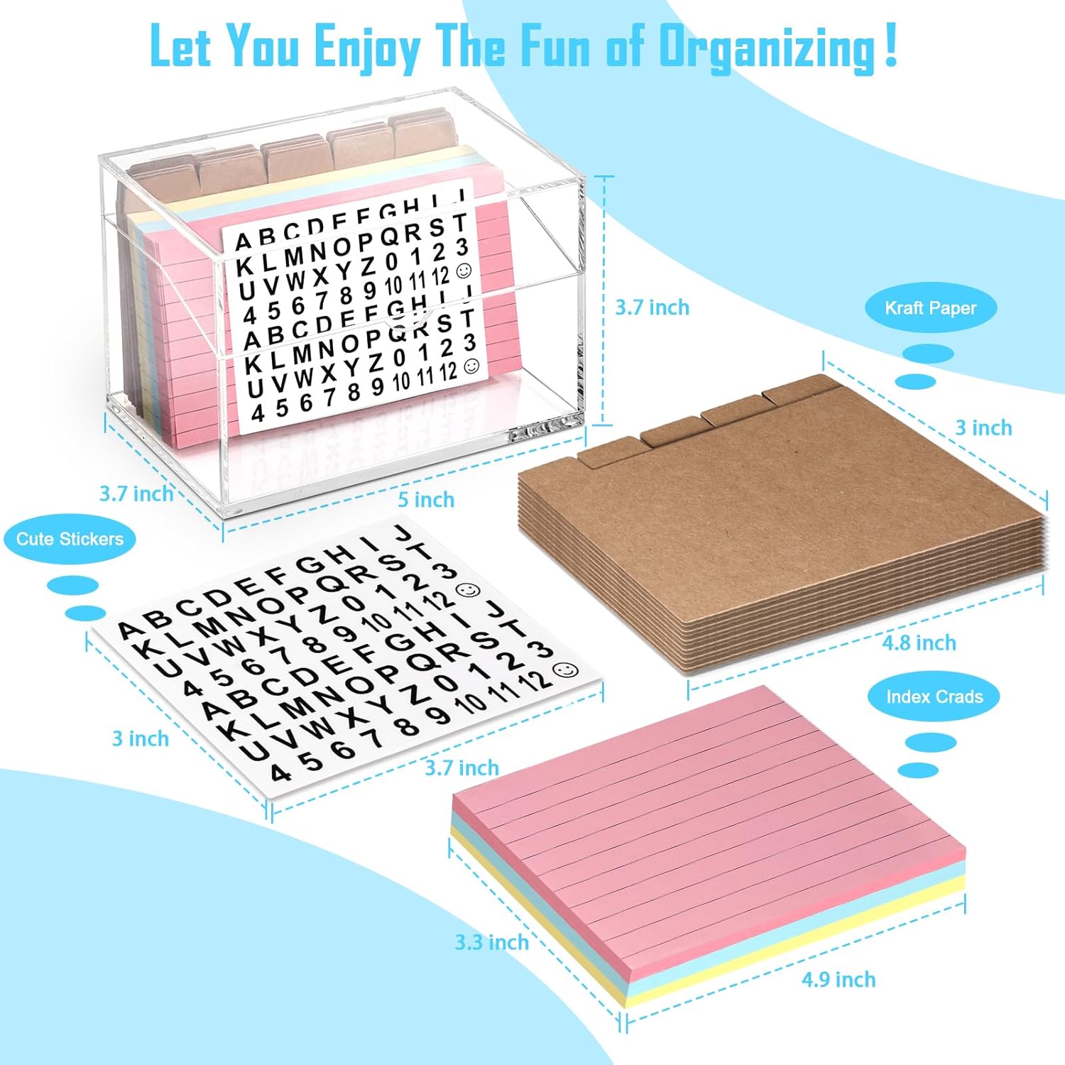 - 1.Classic appearance: This clear index card holder is made of high-quality transparent acrylic material. The 3x5 index card box allows you to easily and intuitively see the color of the index cards inside and the number of remaining cards. Whether it is to quickly find the required cards or manage the card inventory, clear flash card holder is clear at a glance. The index card organizer improves your work efficiency and allows you to enjoy the fun of organizing.