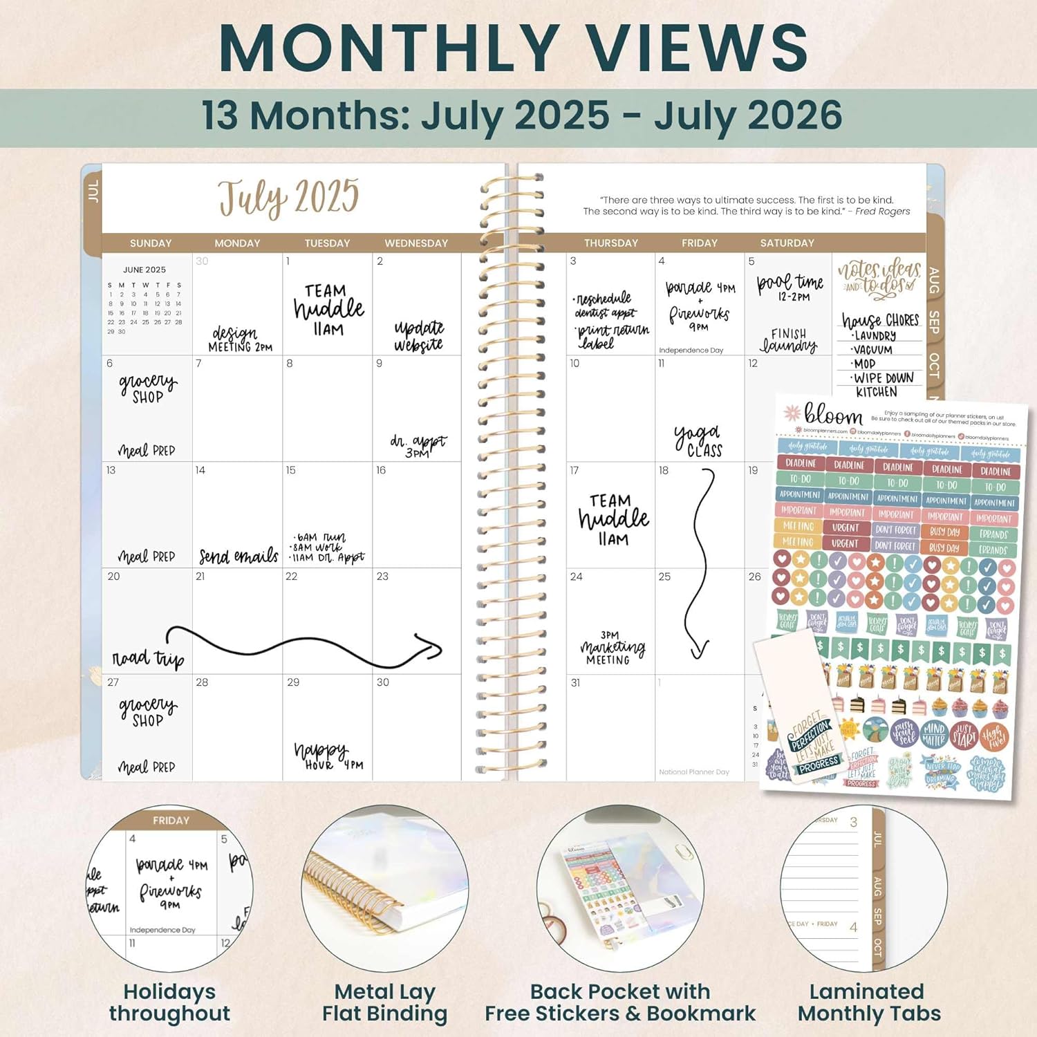 - PREMIUM FEATURES: Soft, lightweight covers made from thick cardstock with gloss film lamination, monthly tabs, deluxe 100gsm bright white bleed-resistant paper, recyclable metal lay-flat spiral binding, front and back inside storage pockets, and a FREE sticker sheet and bookmark!