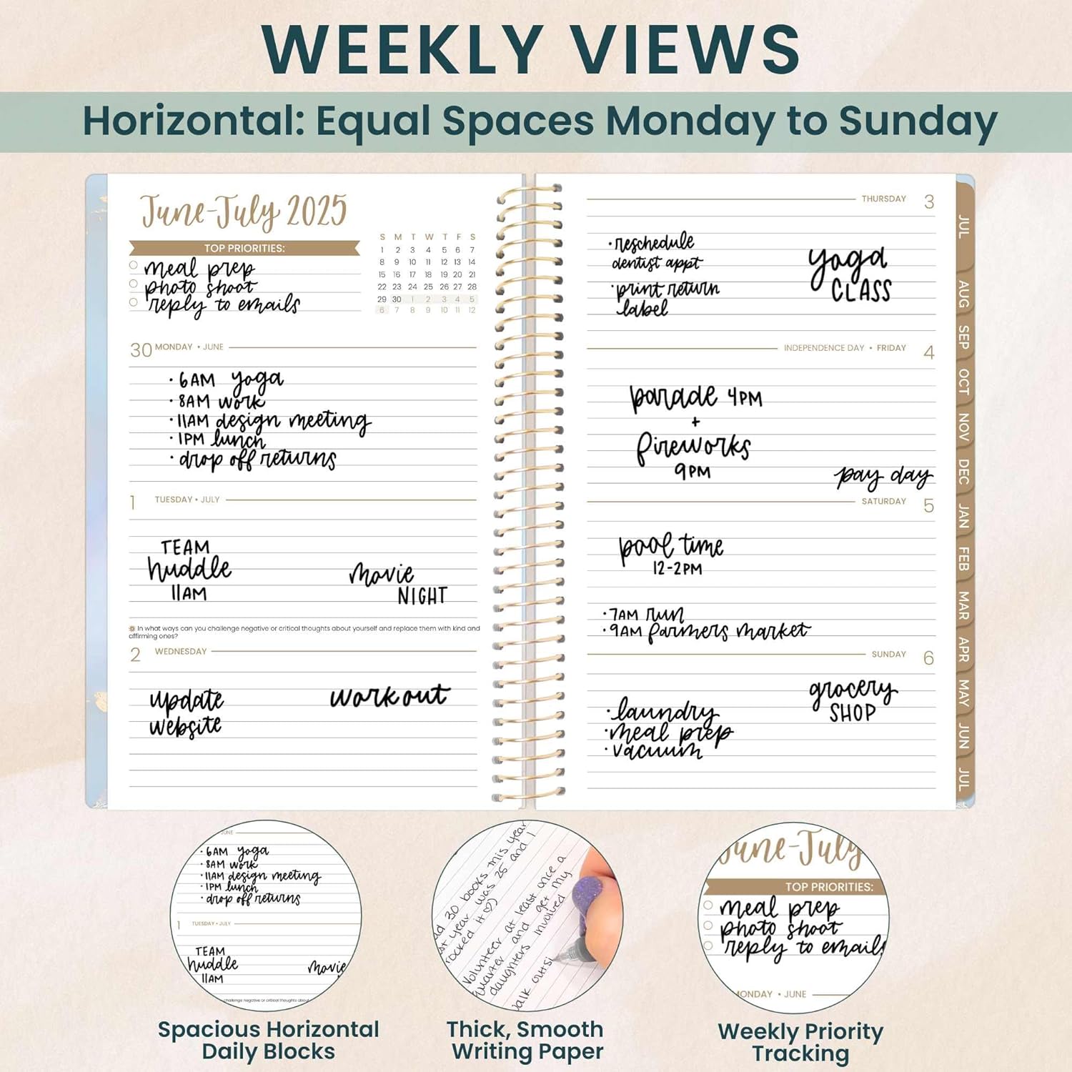 - LAYOUT: 2 page monthly overview spreads and spacious weekly views run academic year, JULY 2025 through JULY 2026 -- 365+ days!