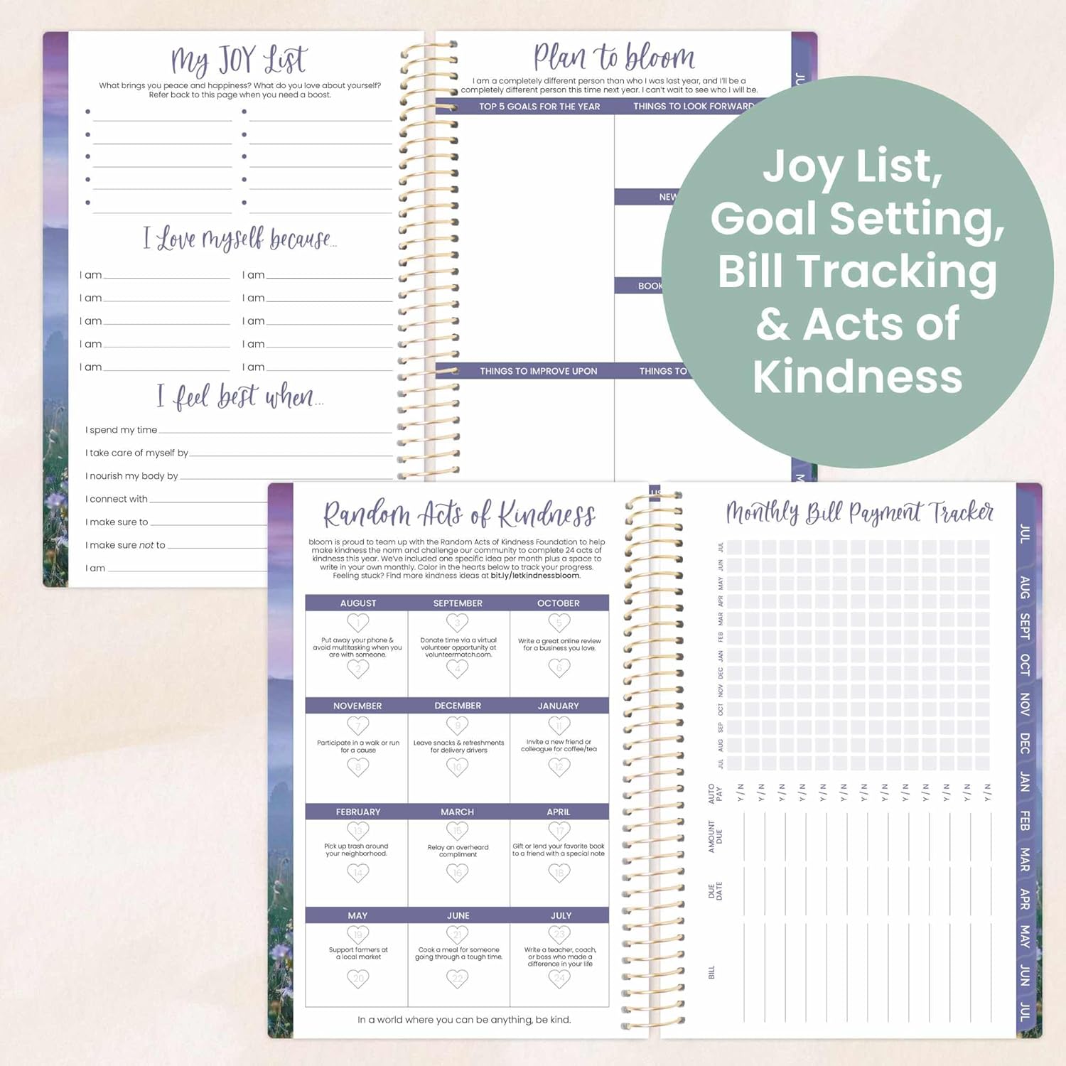 - BONUS ELEMENTS: Packed with life coaching worksheets and inspirational features to help you set and achieve all of your goals for the year: yearly overview, values page, monthly bill tracking, acts of kindness challenges, 9 notes pages, important dates for next year, monthly quotes & more!