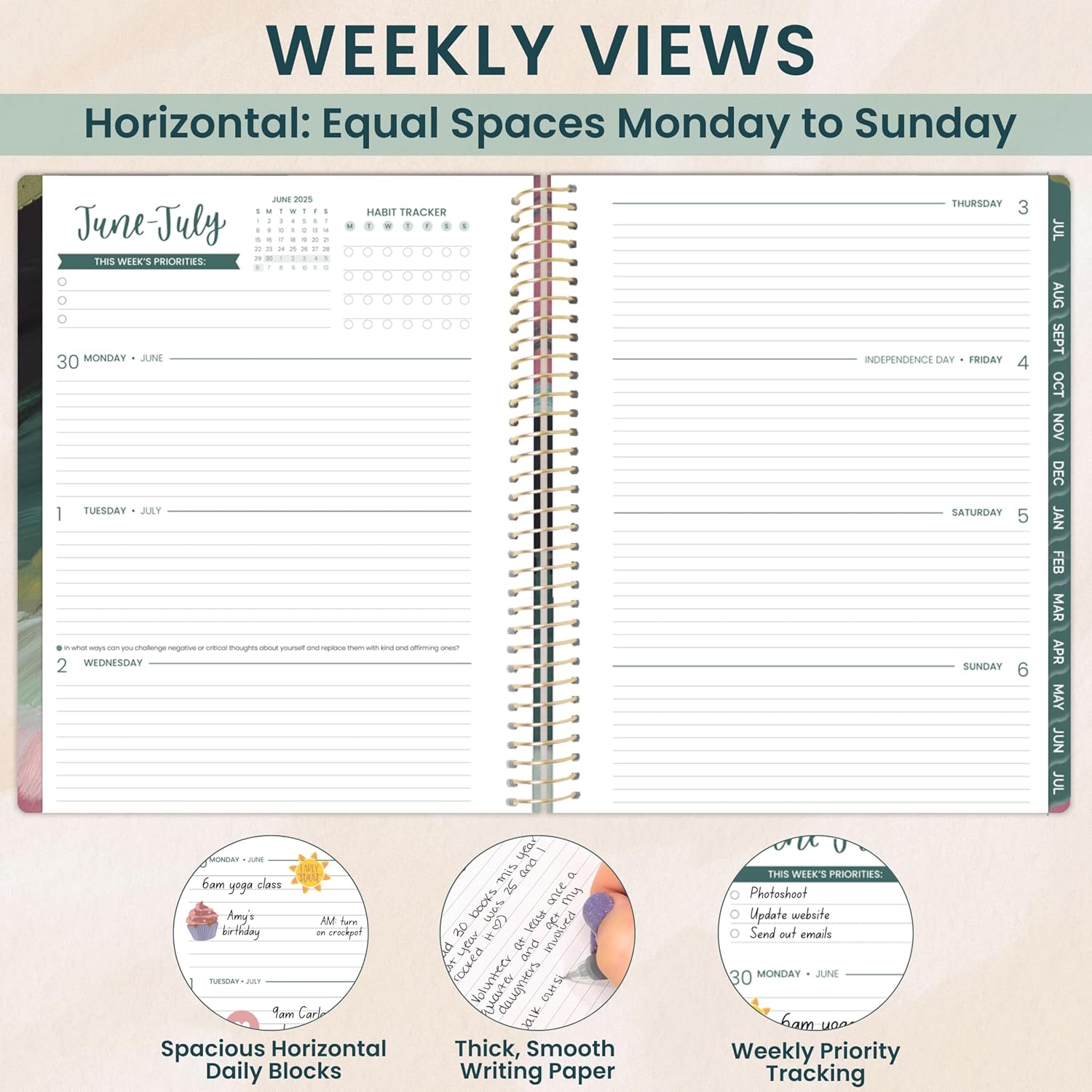 - 8.5” x 11” WITH HORIZONTAL WEEKLY LAYOUT & MONTHLY VIEWS: 2 page monthly overview spreads and spacious weekly views run Academic Year, July 2025 through July 2026. Weekly views are horizontal and include priority & habit tracking.