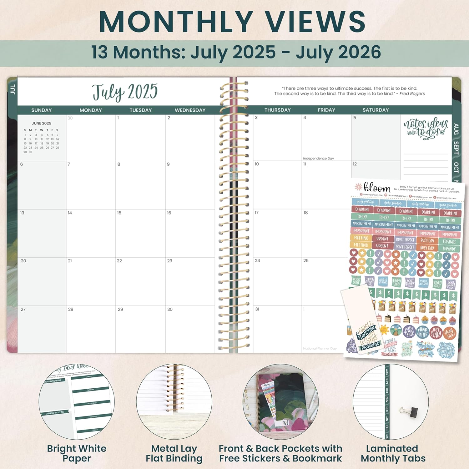 - PREMIUM FEATURES: Soft, lightweight covers made from thick cardstock with gloss film lamination, monthly tabs, deluxe 100gsm bright white bleed-resistant paper, recyclable metal lay-flat spiral binding, vertical front and back inside storage pockets, and FREE magnetic bookmark and stickers now included!