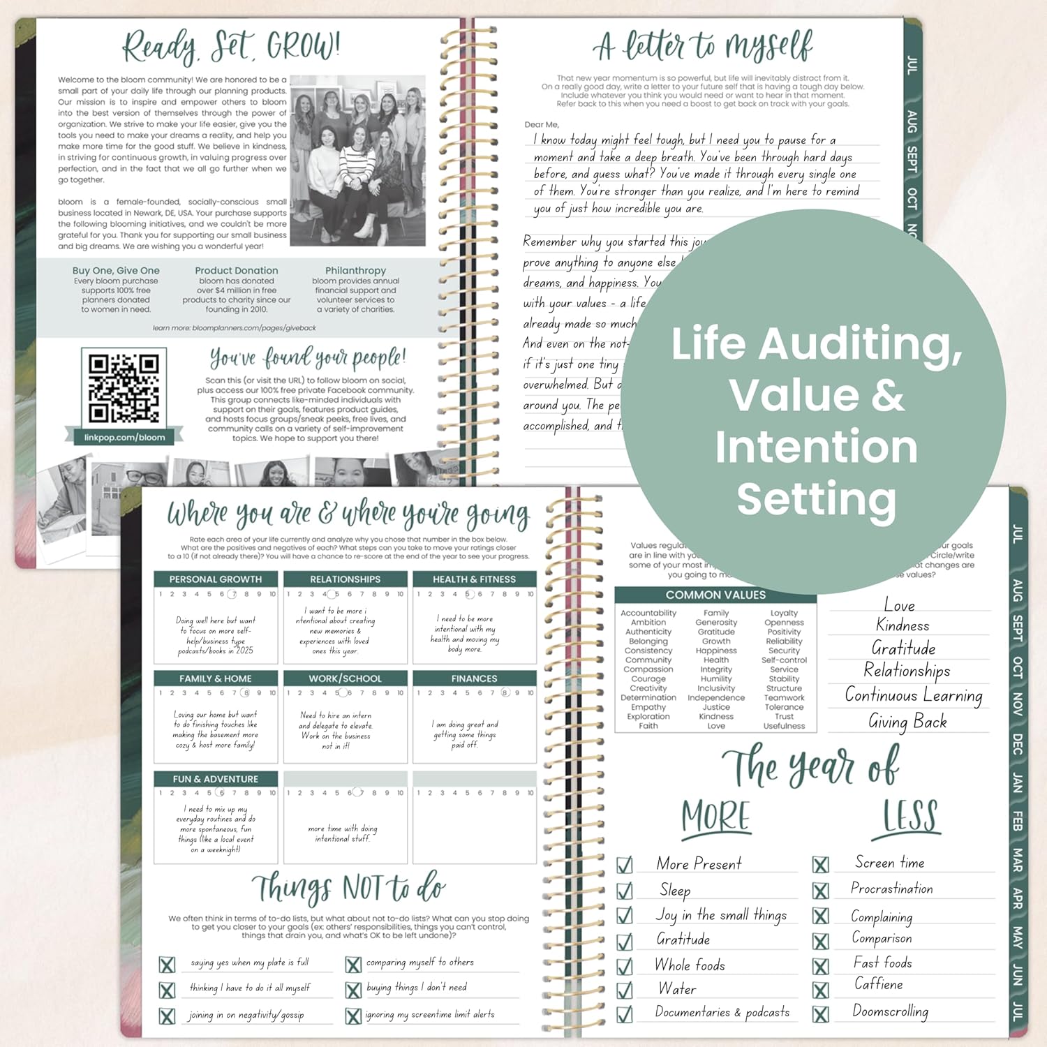 - BONUS ELEMENTS: Packed with life coaching worksheets and inspirational features to help you set and achieve all of your goals for the year: personal mission statement prompt and yearly goal setting page, weekly scheduling template, values page, habit tracking, vision board, monthly spending log, 13 notes pages, inspirational quotes, monthly challenges, and more!