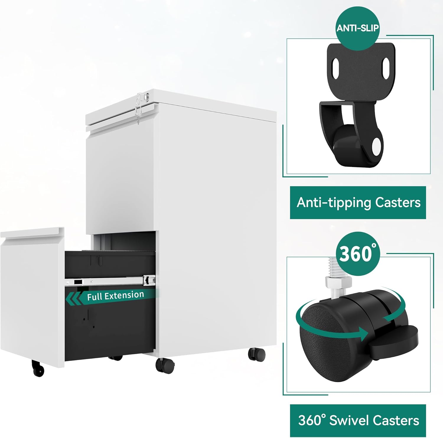 - Free-range Mobility with 5 Casters: This lockable filing cabinet has 4 x 360°swivel casters + 1x anti-tipping central caster; Easy and safe to move! 360°swivel casters provide great mobility and the central caster prevents tipping.