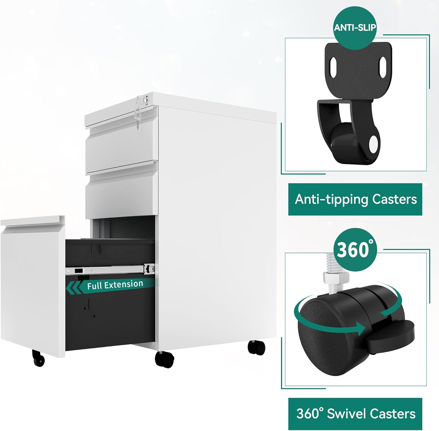 - ăFree-range Mobility with 5 CastersăThis lockable filing cabinet has 4 x 360°swivel casters + 1x anti-tipping central caster; Easy and safe to move! 360°swivel casters provide great mobility and the central caster prevents tipping.
