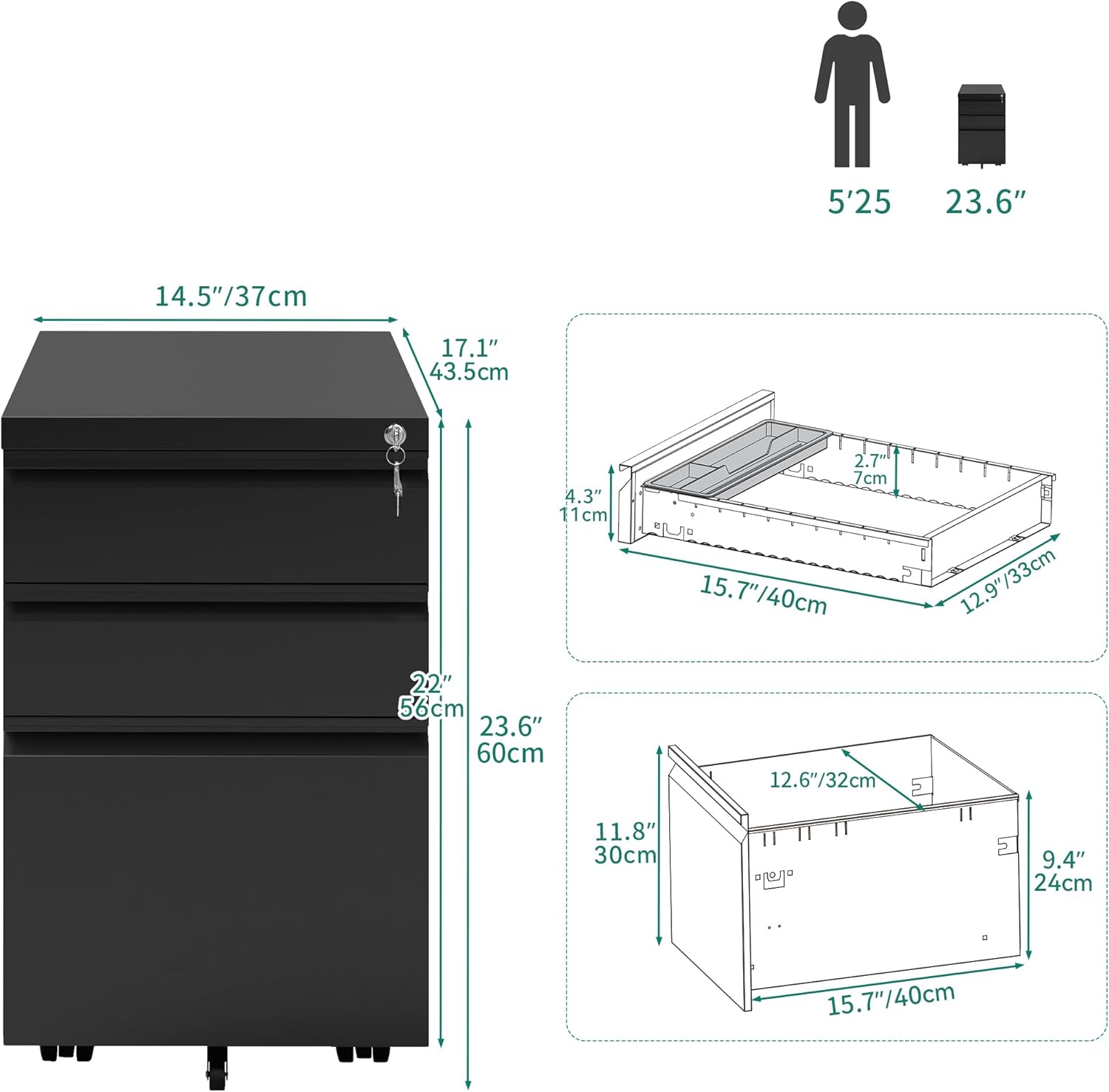 - 【Free-range Mobility with 5 Casters】This lockable filing cabinet has 4 x 360°swivel casters + 1x anti-tipping central caster; Easy and safe to move! 360°swivel casters provide great mobility and the central caster prevents tipping.