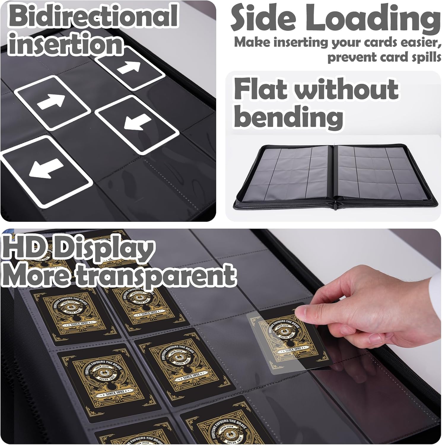 - Function : -Trading Card Binder can not only protect and organize cards, waterproof, scratch-proof, dust-proof, and anti-lost. Advanced reinforced heat-sealed seams technology for trading card binder 16 pocket, flipping through the pages like a book will different with regular MTG binder, even no rings to mess up cards. The side loading pockets also means no cards falling out if you hold the photocard collector upside down
