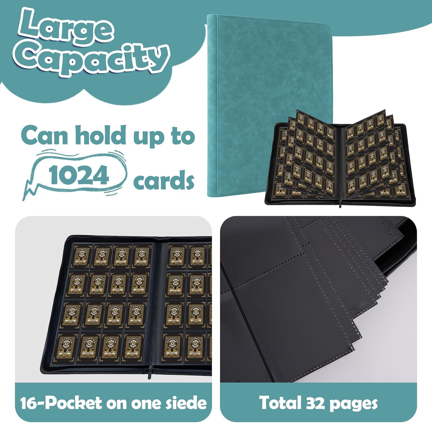 - Large Capacity:This Trading Card Binder with 32 Double Sided Pages,16 pocket per page,holds up to 1024 cards.Provides plenty of space to keep all your cards organized,not disorganized