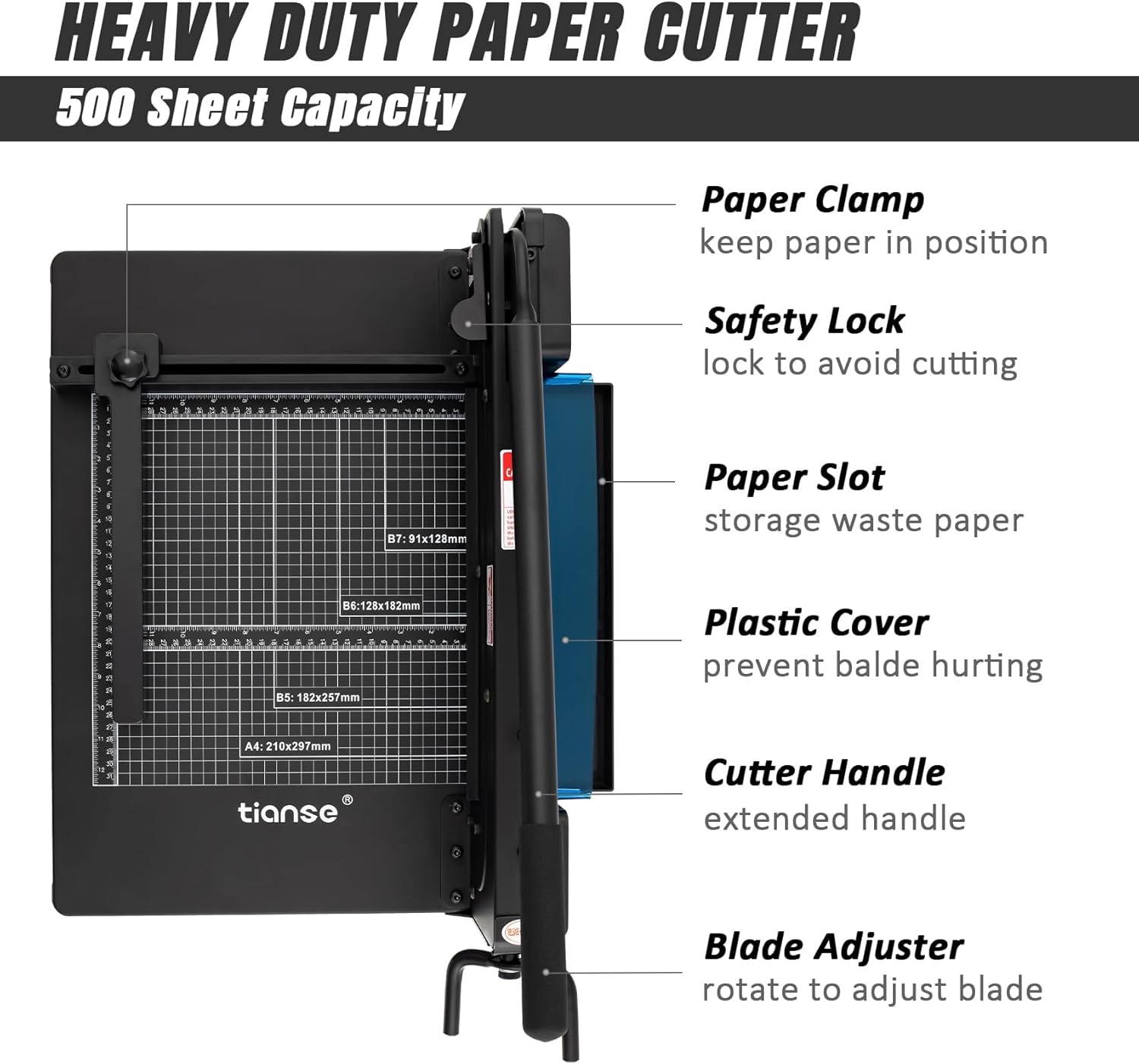 - Safety Lock Design : The security lock on the paper cutter heavy duty is lock to anti handle and blade cut down when placing paper; For safety we have posted a warning message on the paper cutter; please pay attention to the warning message when using it. Notes: You can search the "Demonstration of TS-1431 Heavy Duty Paper Cutter Operation" videos on YouTube.
